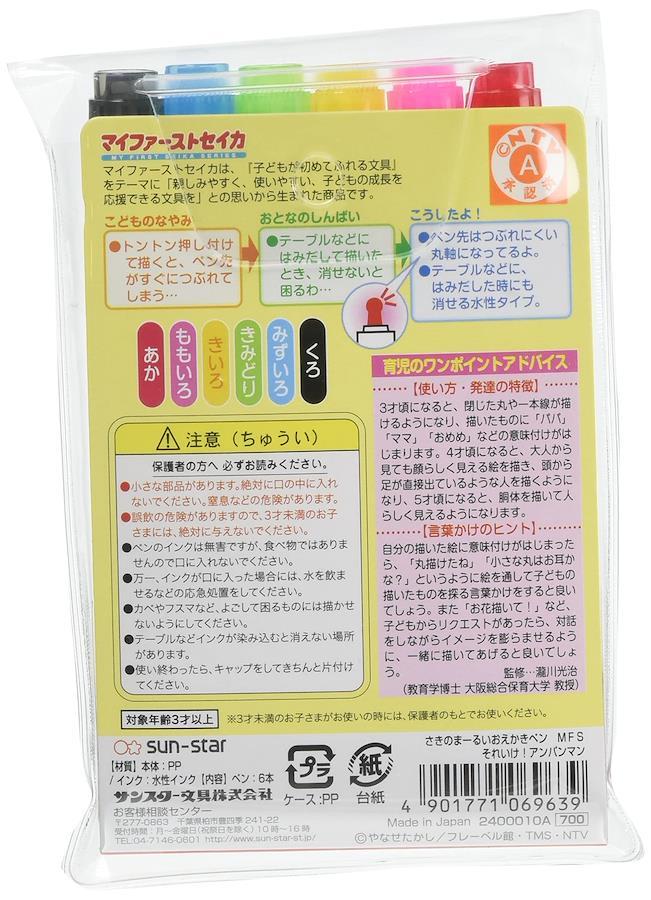 ・思いっきり描いてもつぶれにくい丸型のペン先を採用した水性サインペン・小さいお子様でもブレずに持ちやすい短い軸・発色の良い6色のサインペンで自由にお絵描きできる