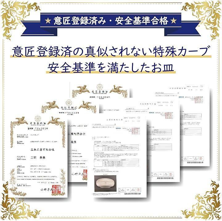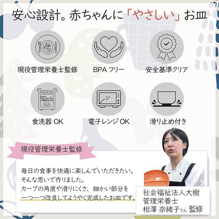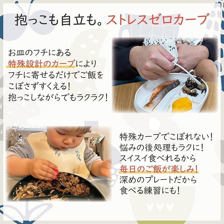 「意匠登録済の特殊カーブ」 プレートのフチには特殊カーブが施されているから、こぼれる心配なし。 滑り止めも付いているから、自分で食べる時も抱っこして食べさせる時もラクラク。