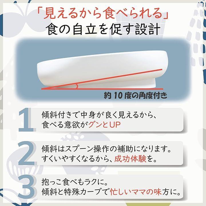 「成功体験」 プレートには傾斜が付いているから、中身が見やすく食欲がアップ。 食欲が湧くだけでなく、特殊カーブと傾斜によりすくいやすくなるため、成功体験を積むことができます。