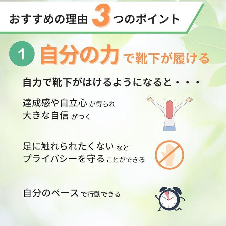 「簡単操作で誰でも使いやすい」足元まで手が届きにくい方や前かがみの姿勢が難しい方でも、一人で簡単に靴下を履くことが可能です。