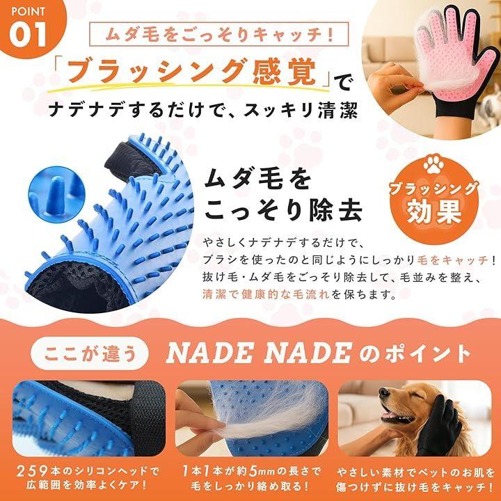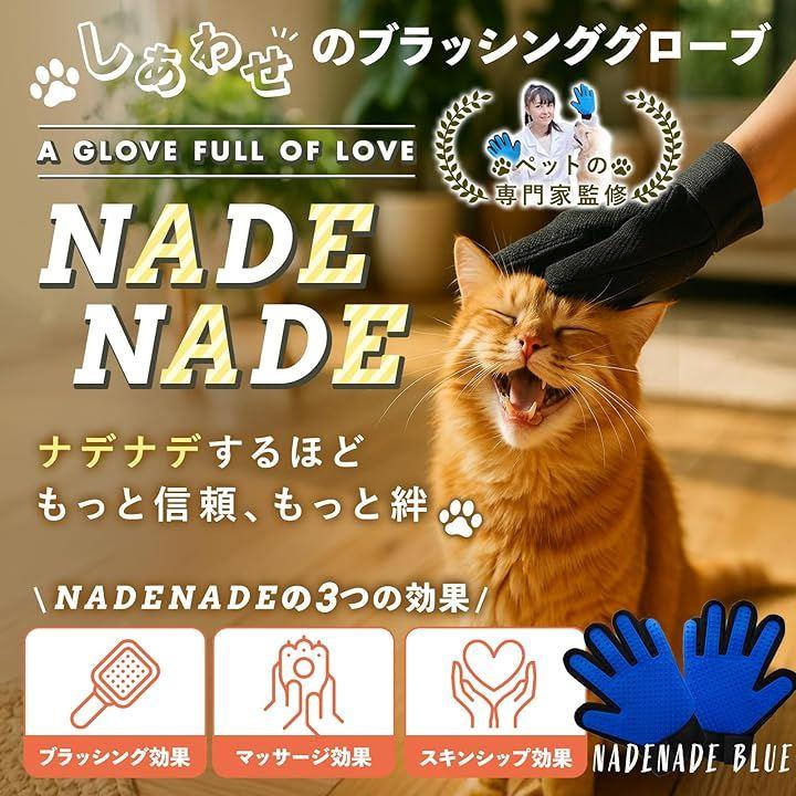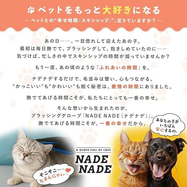 「ブラッシンググローブ NADENADRE ナデナデ」 NADENADEは、「ペットともっと優しく、もっと楽しくふれあいたい」という飼い主さんの声から生まれた両手セットのブラッシンググローブです。