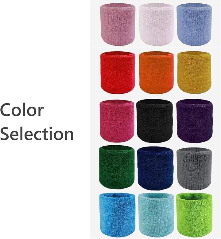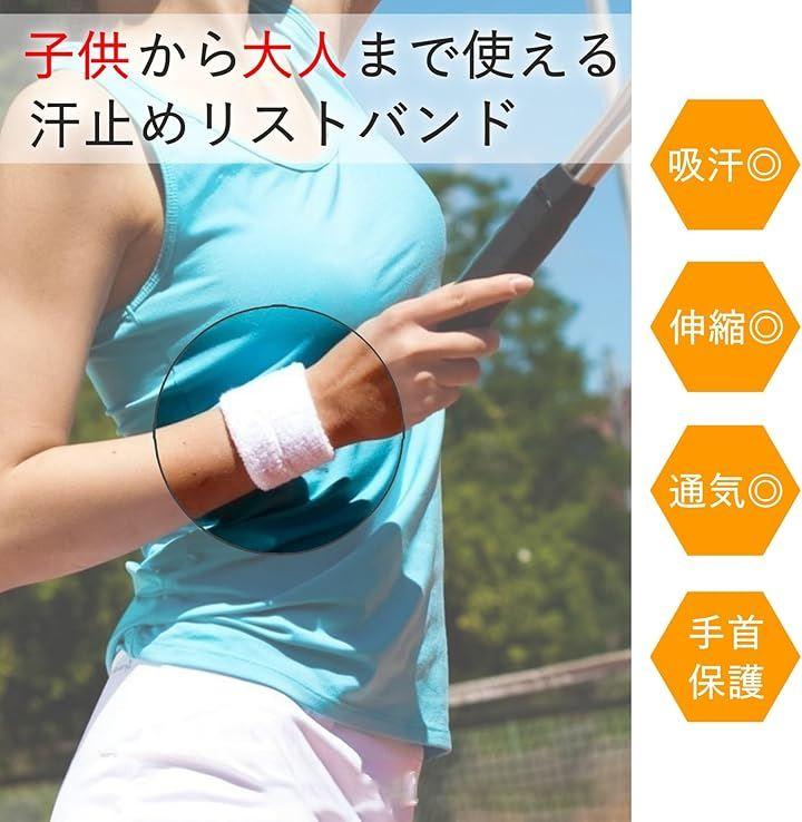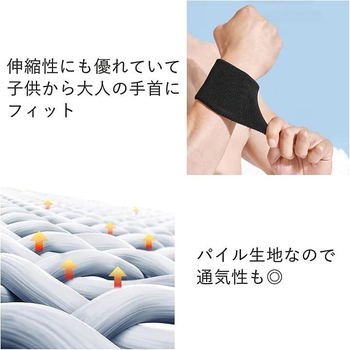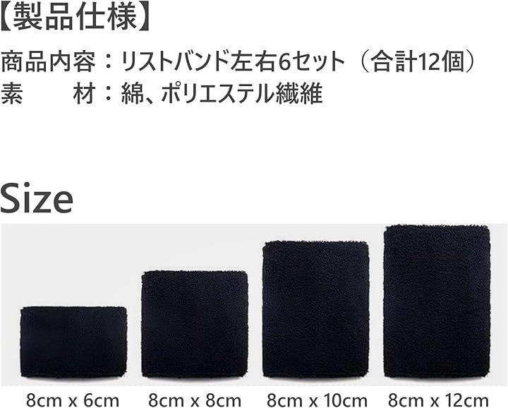 この汗止めバンドは12個入り(6組)で個包装されており、サイズは約長さ8cm x 幅6cmの伸縮性のある素材で、子供やジュニアの手首にぴったりフィットするリストバンドです。