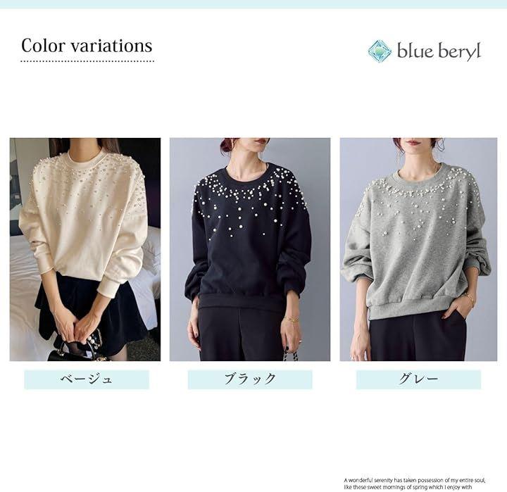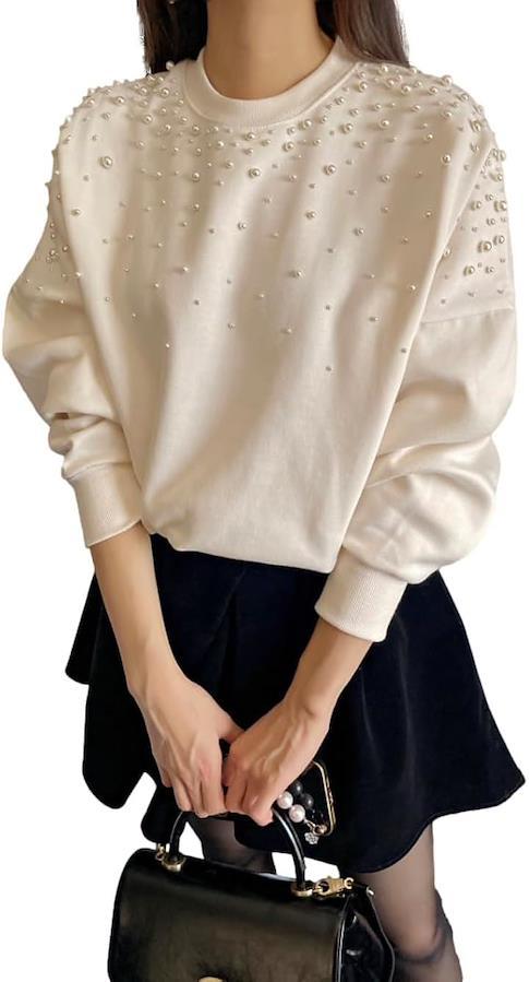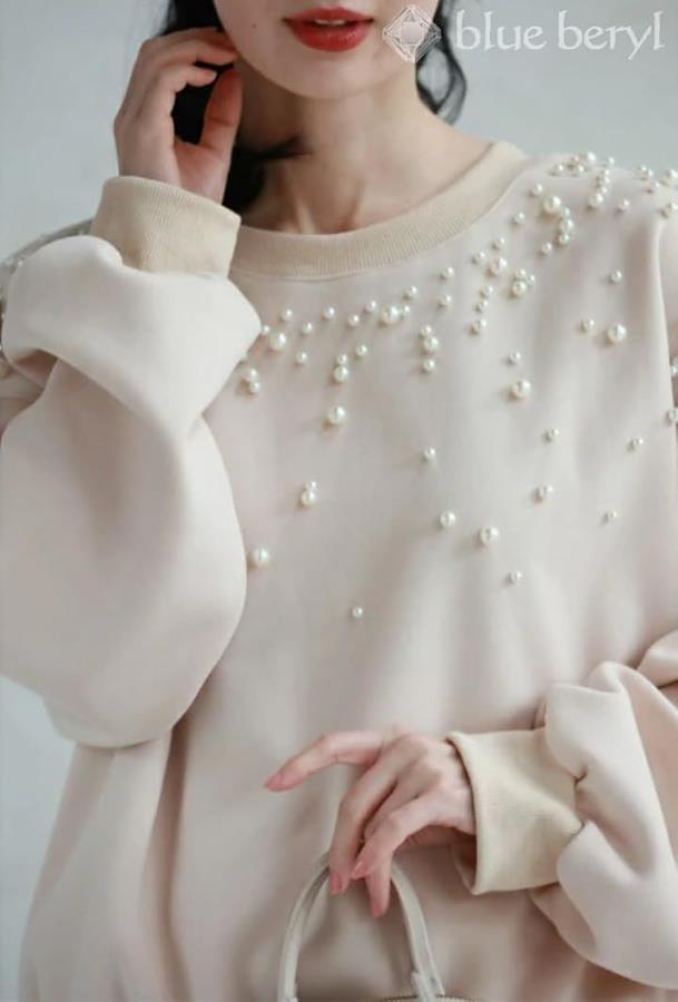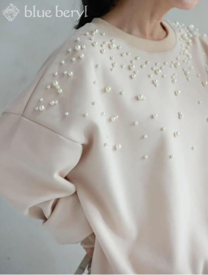 胸元に散らしたパールの飾りが、スタイルにフェミニンさとエレガントさをプラスして。
