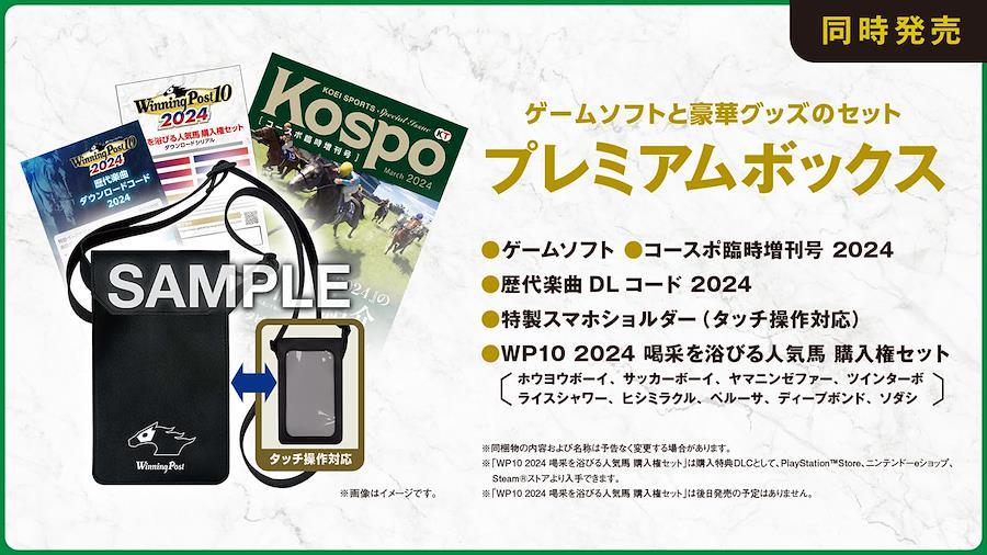 プレミアムボックス同梱内容:1,コースポ臨時増刊号 20242,歴代楽曲DLコード 20243,特製スマホショルダー(タッチ操作対応)4,WP10 2024 喝采を浴びる人気馬 購入権セット(ホウヨウボーイ/サッカーボーイ/ヤマニンゼファー/ツインターボライスシャワー/ヒシミラクル/ペルーサ/ディープボンド/ソダシ)