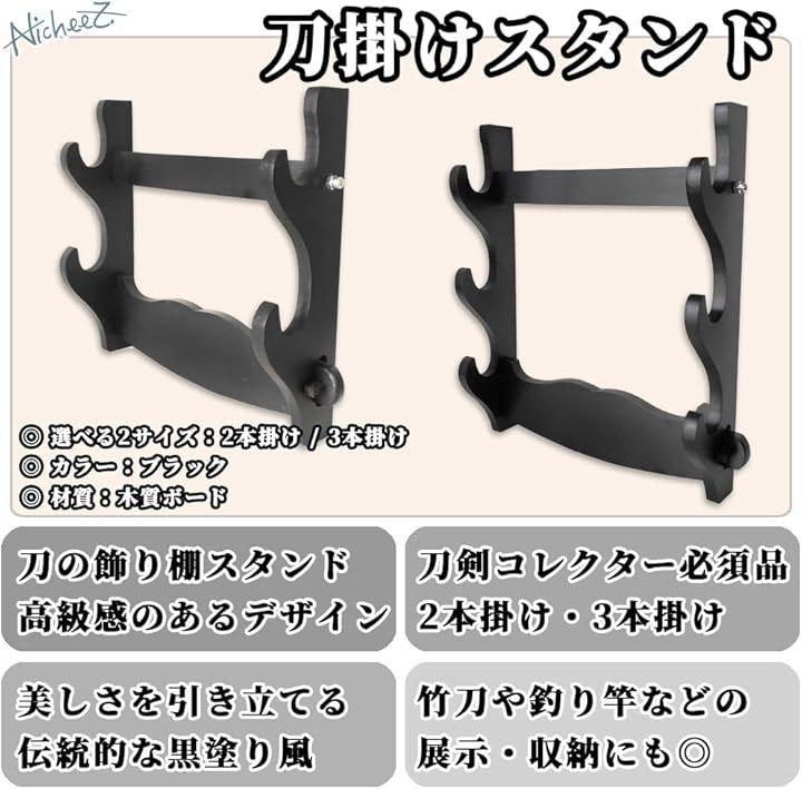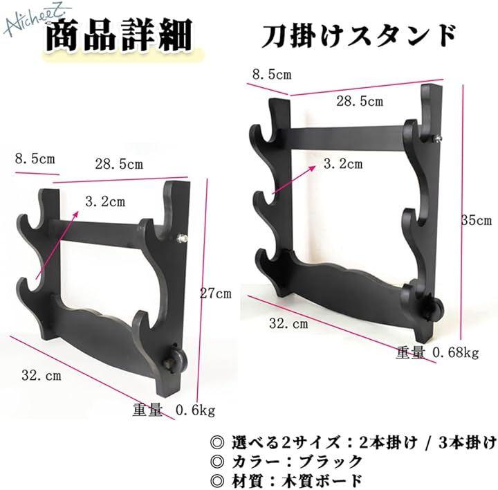 「商品内容」刀掛けスタンド(2本掛け/3本掛け) 材質:木質ボード カラー:ブラック サイズ:(2本掛け)幅/約32cm 高さ/約27cm (3本掛け)幅/約32cm 高さ/約35cm