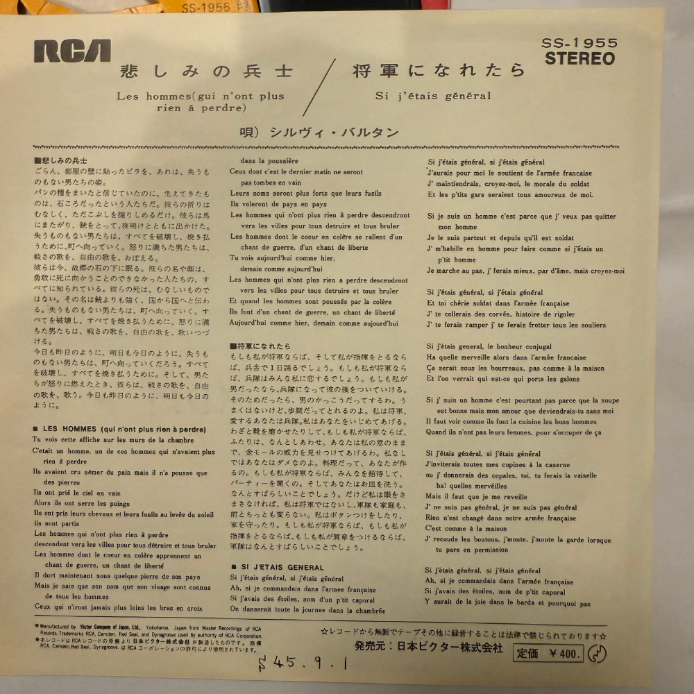 Sylvie Vartan Showa Era Vintage EP Record "Soldier of Sadness: If I Could Become a Shogun" 7-inch Extended Play