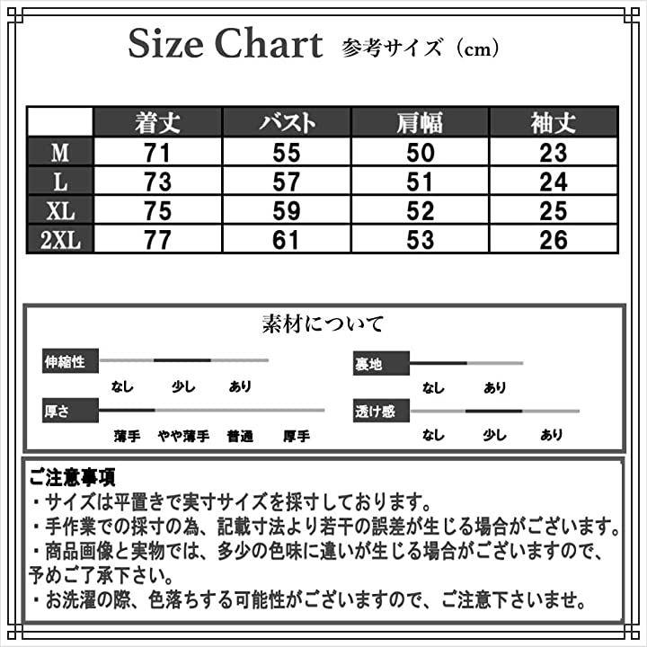 ・「カラー」ホワイト・ブラック・パープル・イエロー「サイズ」 Mサイズ:着丈:71cm/バスト:55cm/袖丈23cm/肩幅:50cm Lサイズ:着丈:73cm/バスト:57cm/袖丈24cm/肩幅:51cm XLサイズ:着丈:75cm/バスト:59cm/袖丈25cm/肩幅:52cm 2XLサイズ:着丈:77cm/バスト:61cm/袖丈26cm/肩幅:53cm