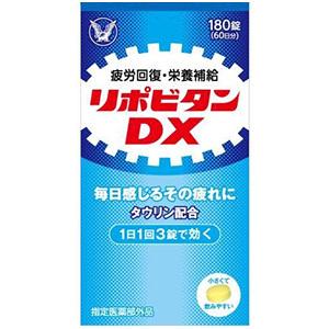 ■商品概要メーカー:大正製薬商品名:リポビタンDX(180錠)区分:医薬部外品内容量:180錠商品概要:【指定医薬部外品】毎日感じるその疲れに、1日1回3錠で効くJANコード:4987306030213商品コード:079512754■商品の特徴リポビタンDXは、糖質・脂質・タンパク質を生命活動に必要なエネルギーに変換するエナジーサイクルに働きかけ、疲労の回復や予防に役立ちます。加えて、体力・身体抵抗力又は集中力の維持・改善、栄養不良に伴う寝つきの悪さ・目覚めの悪さの改善などにも優れた効果を発揮します。 寝る前にも気にならないカフェインゼロ設計で、日々の元気をサポートします。■効能・効果☆疲労の回復・予防 ☆日常生活における栄養不良に伴う身体不調の改善・予防:疲れやすい・疲れが残る・体力がない・身体が重い・身体がだるい、肩・首・腰又は膝の不調、二日酔いに伴う食欲の低下・だるさ、寝付きが悪い・眠りが浅い・目覚めが悪い、肌の不調(肌荒れ、肌の乾燥) ☆体力、身体抵抗力又は集中力の維持・改善 ☆虚弱体質(加齢による身体虚弱を含む。)に伴う身体不調の改善・予防:疲れやすい・疲れが残る・体力がない・身体が重い・身体がだるい、肩・首・腰又は膝の不調、寝付きが悪い・眠りが浅い・目覚めが悪い、肌の不調(肌荒れ、肌の乾燥) ☆病中病後の体力低下時、発熱を伴う消耗性疾患時、食欲不振時、妊娠授乳期又は産前産後等の栄養補給■原材料/成分/素材/材質[3錠中] タウリン 500mg、チアミン硝化物(ビタミンB1) 10mg、リボフラビン(ビタミンB2) 5mg、ピリドキシン塩酸塩(ビタミンB6) 5mg、アスコルビン酸カルシウム 100mg(ビタミンCとして82.6mg)、カルニチン塩化物 10mg、グリシン 5mg、サンヤク末 10mg、シゴカ乾燥エキス 8mg(シゴカ200mgに相当)添加物:無水ケイ酸、セルロース、ヒドロキシプロピルセルロース、ステアリン酸Mg、タルク、マクロゴール、酸化チタン、ヒプロメロース、三二酸化鉄、カルナウバロウ■対象年齢/性別15歳以上■賞味期限/使用期限(製造から)3年■使用方法/召し上がり方水又はぬるま湯で服用してください。■使用上の注意1.定められた用法・用量を厳守してください。(他のビタミン等を含有する製品を同時に服用する場合には過剰摂取等に注意してください)2.服用に際しては、説明書をよく読んでください。3.直射日光の当たらない湿気の少ない涼しい所に密栓して保管してください。4.小児の手の届かない所に保管してください。5.使用期限を過ぎた製品は服用しないでください。■メーカー希望小売価格(税込)6468円■発売元/製造元/輸入元大正製薬