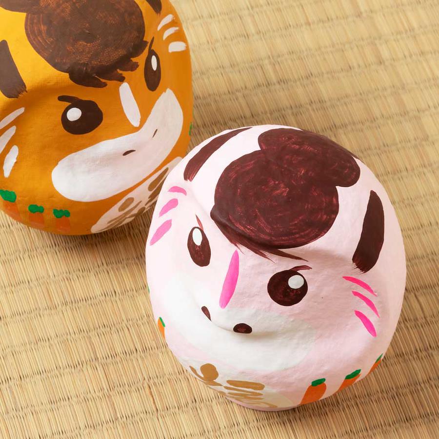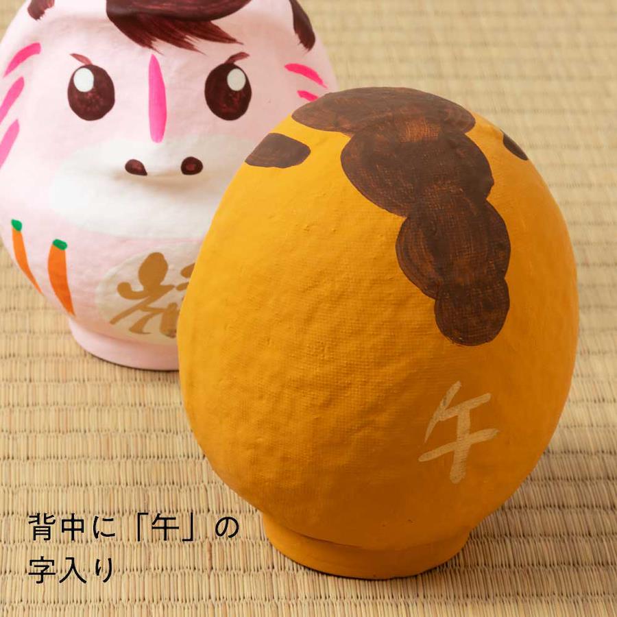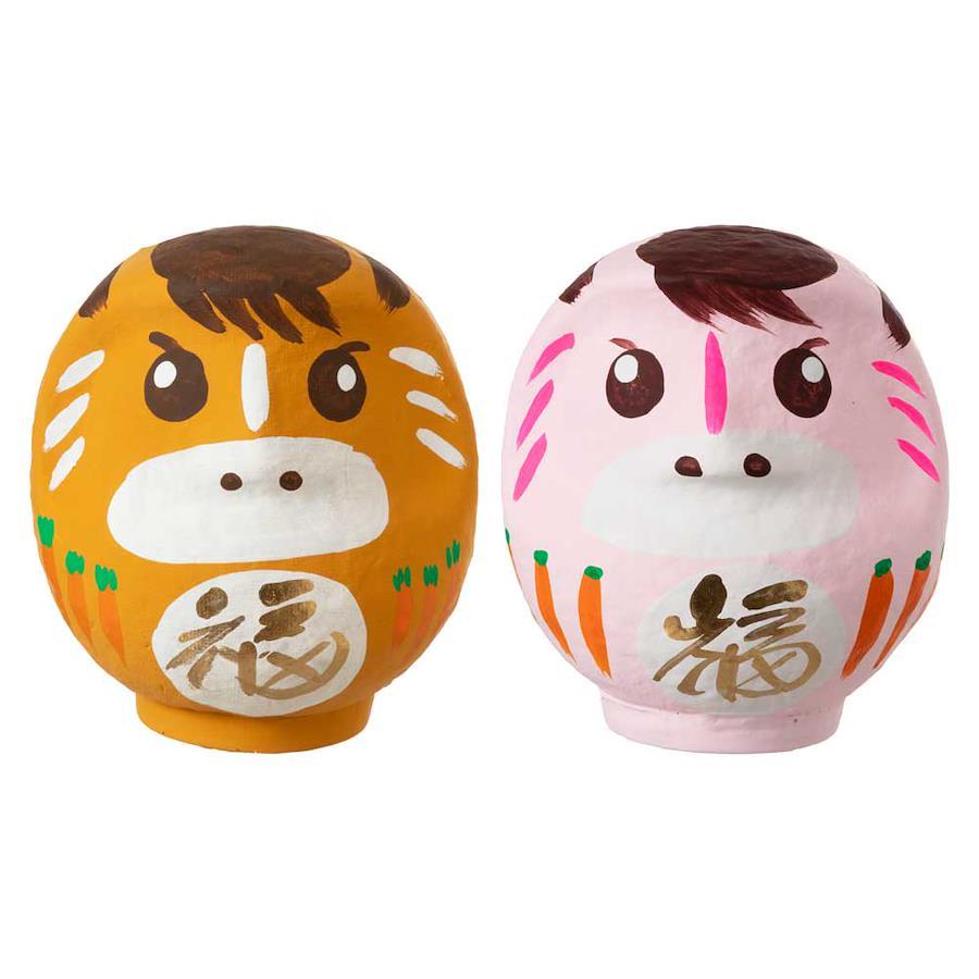 午の達磨はこうなるだろうなと想像した通り、可愛らしい顔がぴったりはまり、そしてお腹には福の一文字。茶・桃どちらも馬の特徴であるたてがみと鼻筋が描かれ、お腹にはにんじんという愛らしいイメージに仕上がりました。縁起物ですので、プレゼントにも喜ばれますよ。