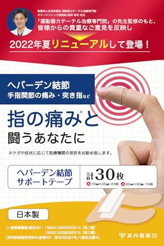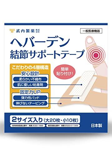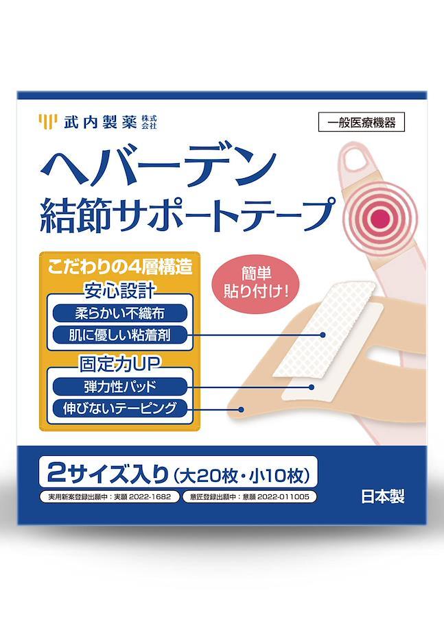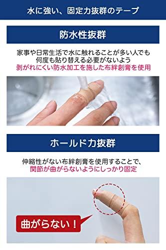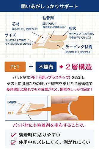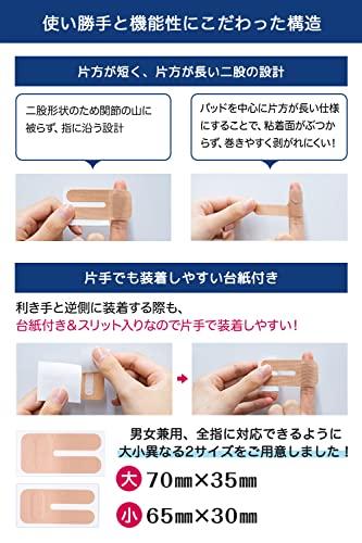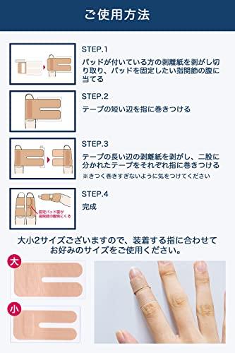 ?【専門医監修】運動器カテーテル治療専門医の奥野先生監修!へバーデン結節サポートテープ ?【2層構造でしっかりサポート】しっかり固定しながら肌に触れる部分は優しい素材を使用した、PETに不織布を乗せた2層構造。長時間の装着でも不快感なく指をしっかり固定。 ?【抜群の防水性&ホールド力】伸縮性がない絆創膏に防水加工を施したこだわりの仕様。家事や日常生活で水に触れた後でも貼り替え不要。 ?【機能性にこだわった構造】関節の山に被らず指に沿う二股設計。台紙付き&スリット入りで片手でも簡単に装着可能。さらに全指に対応できるよう大小異なる2サイズ。 ?【使い方】①パットが付いている方の台紙を剥がし切り取り、パッドを固定したい指関節の腹に当てる ②テープの短い辺を指に巻き付ける ③テープの長い辺の台紙を剥がし、二股に分かれたテープをそれぞれ指に巻きつける。