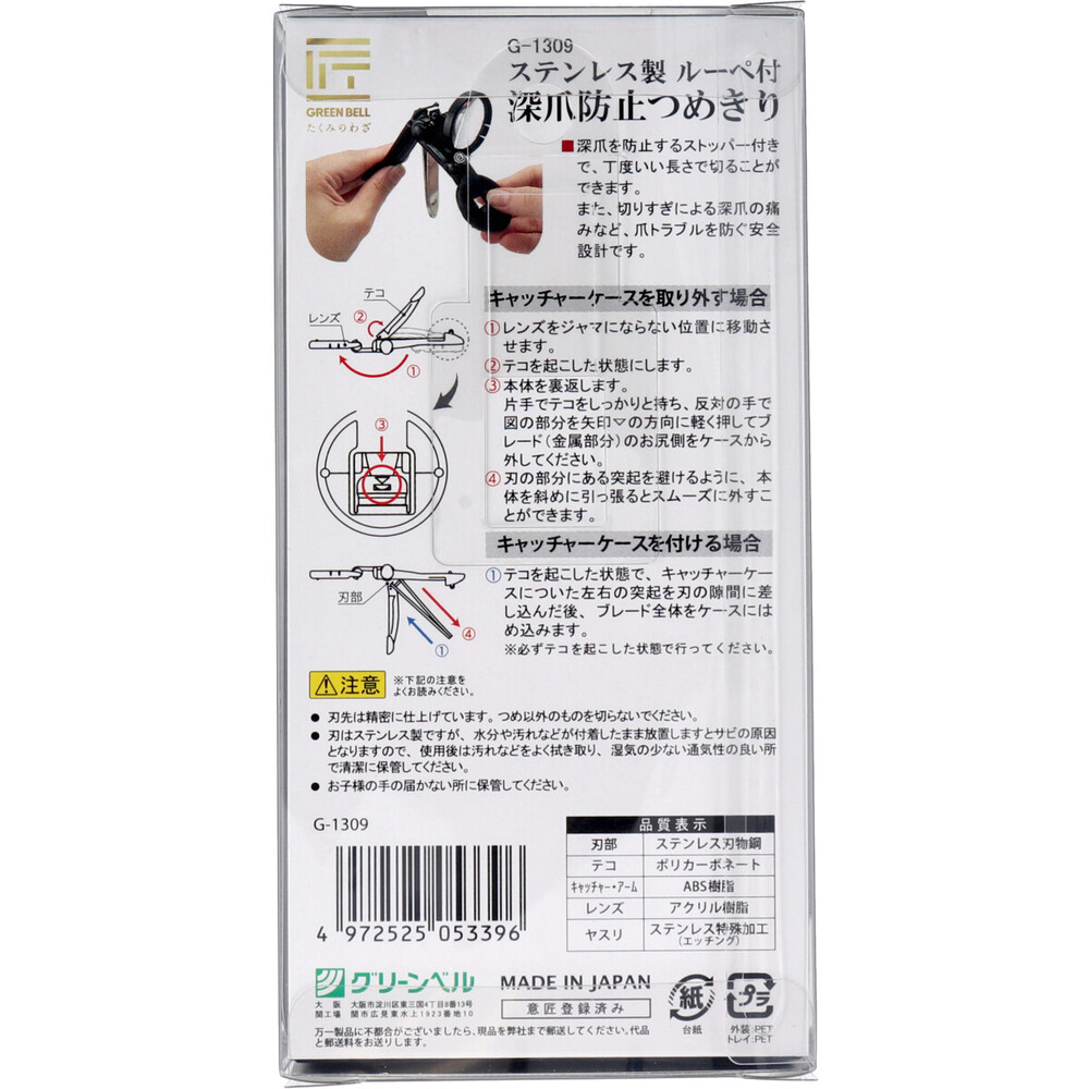 【品質表示】刃部:ステンレス刃物鋼テコ:ポリカーボネートキャッチャー・アーム:ABS樹脂レンズ:アクリル樹脂ヤスリ:ステンレス特殊加工(エッチング)
