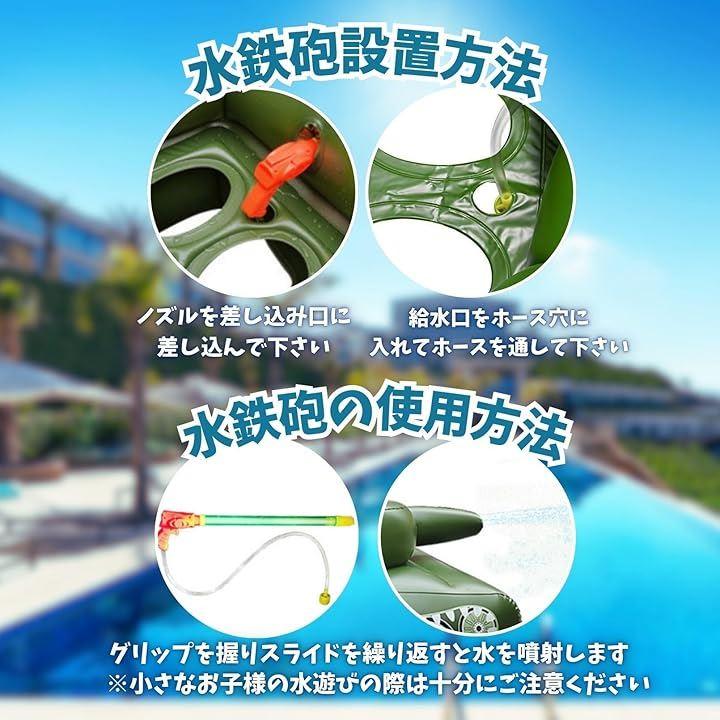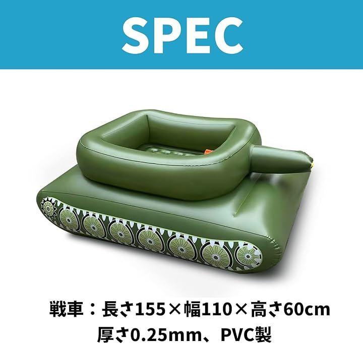 戦車:長さ155x幅110x高さ60cm、厚さ0.25ミリ、水鉄砲:寸法記載なし、PVC製*小さなお子様の水遊びの際は十分にご注意ください。