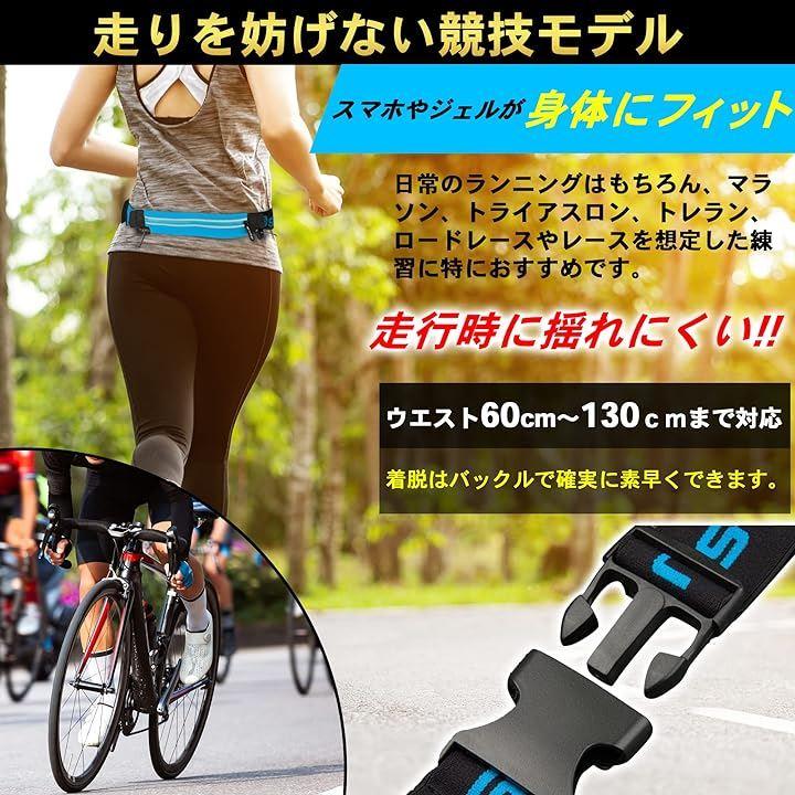 ・伸縮性の高いベルトで、スマホやジェルが体にフィットし、走行時に揺れにくい。