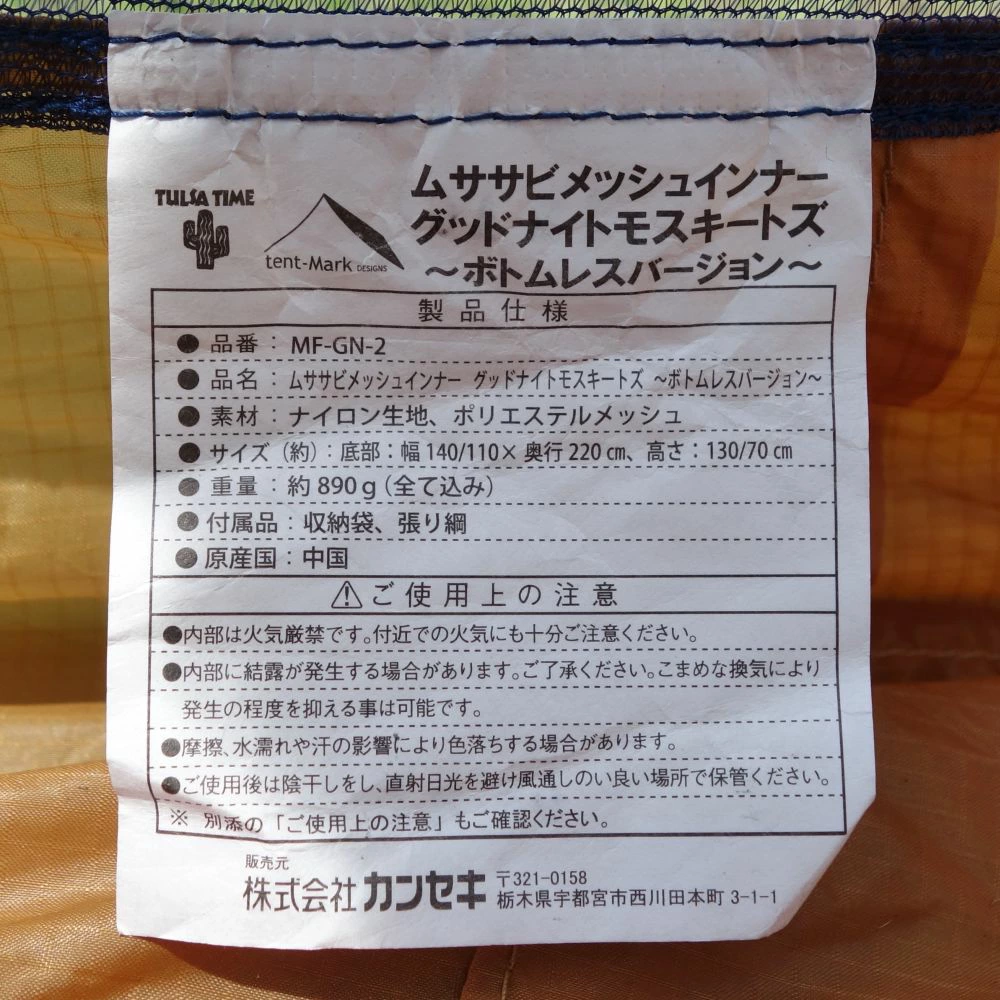 ■商品名テンマクデザイン tent-Mark DESIGNS ムササビ メッシュインナー グッドナイト モスキートズ ボトムレスバージョン MF-GN-2 - サイズ-■状態説明・tent-Mark DESIGNS「ムササビ メッシュインナー グッドナイト モスキートズ ボトムレスバージョン MF-GN-2」です♪・張り縄2本を前後に引っ張るだけの簡単設営◎タープの下でも快適に寝ることができるモスキートネット!・サイズ 約140/110(底部)×D220×H130/70cm・スカートボトム部分生地にベタつきがございます。・その他ご使用に差し支えるようなダメージは無くまだまだご使用頂ける状態です♪※入口が元々ない商品になります。設営後ペグからループを外し潜り込むものとなります!【付属品:本体、フレームポール レッド×2、リペアパイプ、ロープ、収納袋】9枚目写真掲載以外の付属なし■素材-■カラー-■表記サイズ-■実寸サイズ収容人数:約1~2人■状態ランクB 傷や汚れがあるが、まだまだ使用可能な状態■店舗管理番号ce08dl-rk26y09929