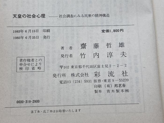 商品名:天皇の社会心理―社会調査にみる民衆の精神構造 (1983年) 彩流社 斎藤 哲雄