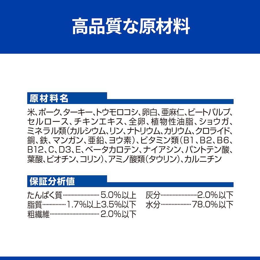米、ポーク、ターキー、トウモロコシ、卵白、亜麻仁、ビートパルプ、セルロース、チキンエキス、全卵、植物性油脂、ショウガ、ミネラル類(カルシウム、リン、ナトリウム、カリウム、クロライド、銅、鉄、マンガン、亜鉛、ヨウ素)、ビタミン類(B1、B2、B6、B12、C、D3、E、ベータカロテン、ナイアシン、パントテン酸、葉酸、ビオチン、コリン)、アミノ酸類(タウリン)、カルニチン