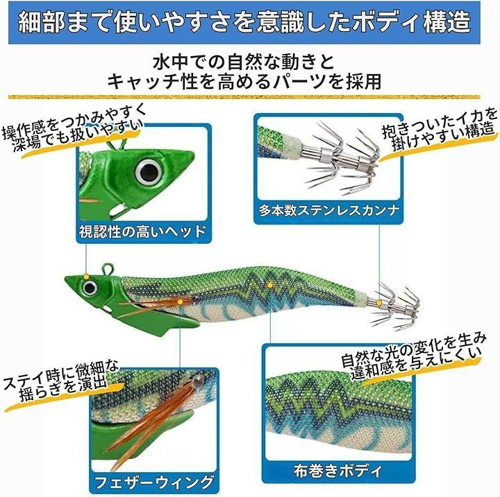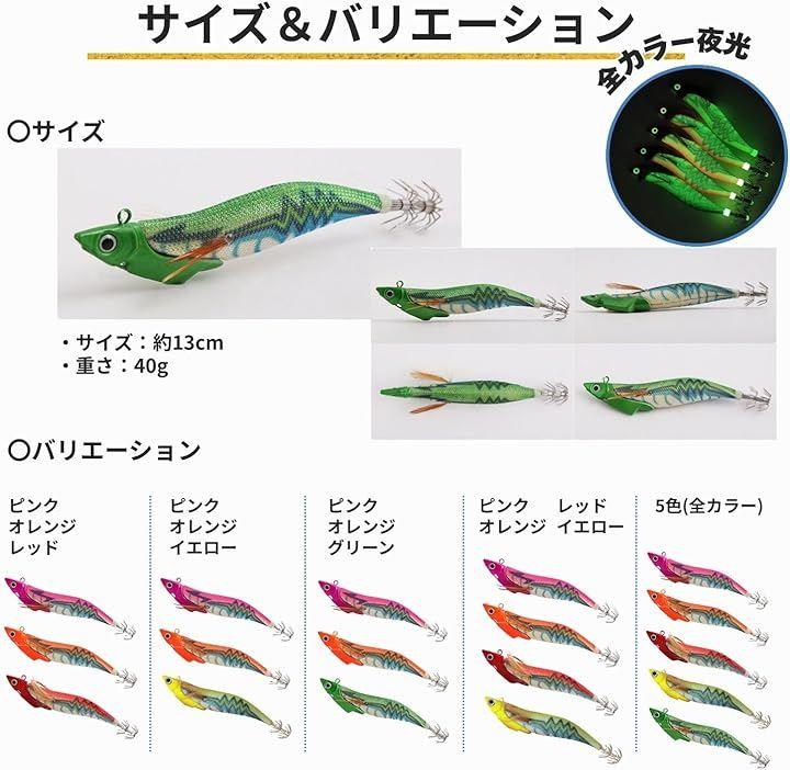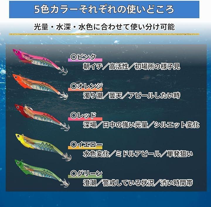 「夜光ボディ採用で低光量下でもアピール&5色カラー展開」本エギは夜光仕様のボディを採用しており、深場や朝夕の光量が少ない場面でも視認性を確保しやすい設計です。
