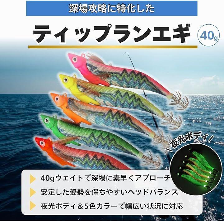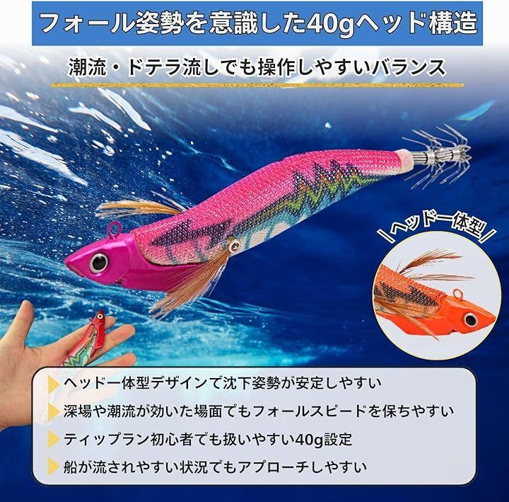 ティップランエギングに適した40gウェイトを採用しており、水深のあるエリアでも素早く沈下しやすい構造です。