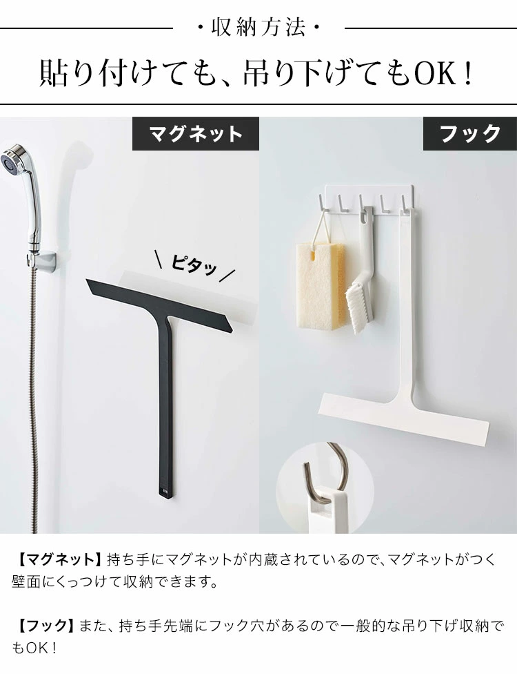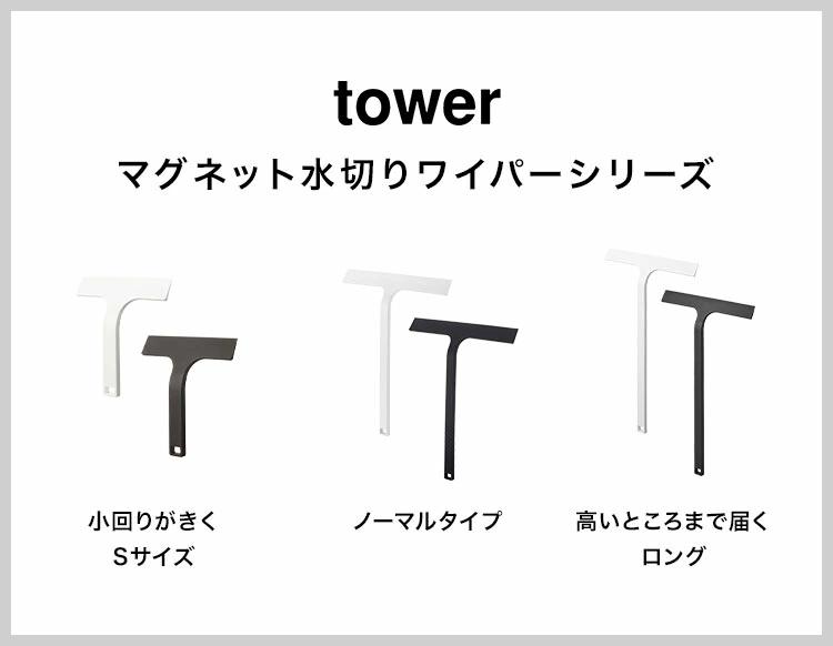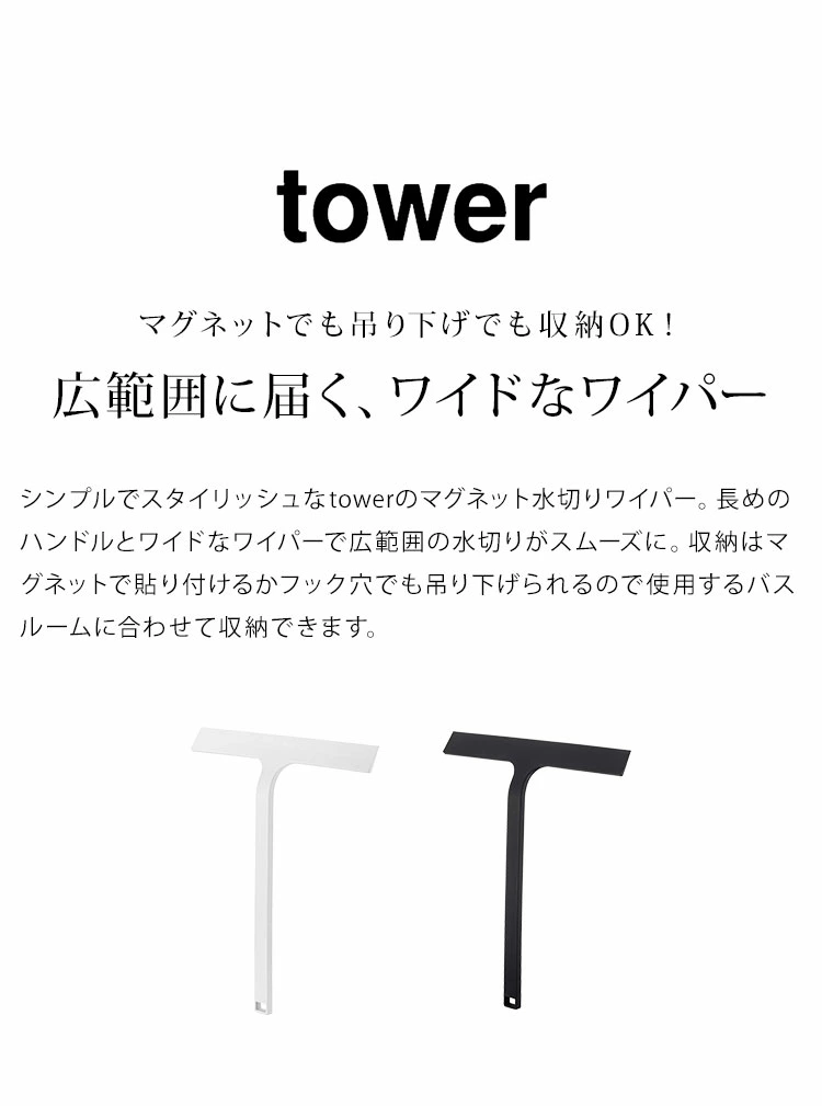 【マグネット水切りワイパー】シンプルでスタイリッシュなtowerのマグネット水切りワイパー。長めのハンドルとワイドなワイパーで広範囲の水切りがスムーズに。収納はマグネットで貼り付けるかフック穴でも吊り下げられるので使用するバスルームに合わせて収納できます。