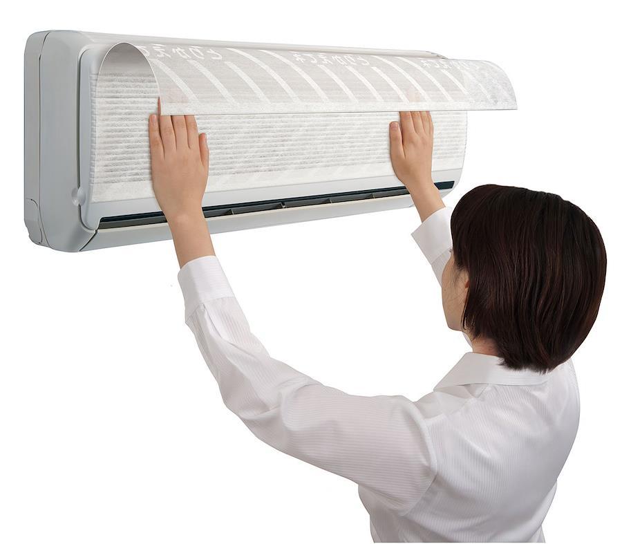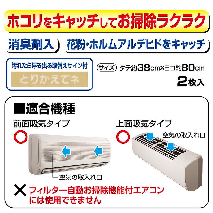 ホコリ、花粉臭いもキャッチ。新採用!背割れフィルム。もっと取付カンタンに!!【特長】・この製品は、エアコンの溝に溜まるゴミやホコリを防ぎ、エアコン内部のフィルタの 汚れを軽減するためのものです。・エアコンの内部に入り込むホコリや花粉、ホルムアルデヒドをキャッチします。・粘着タイプのフィルターなので、取付けがシールのように簡単・キレイに行えます。・フィルターが汚れたら取替えサインが浮き出るので、取替え時期が一目で分かります。・消臭剤入りの繊維を使用しているので、お部屋の嫌な臭いを軽減する効果があります。・冷房・暖房・除湿・送風など、いずれの場合でも使用することができます。・再生PET繊維使用・非塩素系樹脂繊維使用(焼却時塩素ガス非発生) 【使用方法】・新採用「背割れフィルム」で取付けラクラク!・エアコンの幅に合わせて本製品をカッ卜すると、よりフィットしてご使用できます。 ・木目調等の塗装しているエアコンには使用しないでください。のり残りする場合があります。・空気取入れ口が開閉するタイプやフィルター自動お掃除機能がついているタイプには使用しないでください。・フィルターを取外し