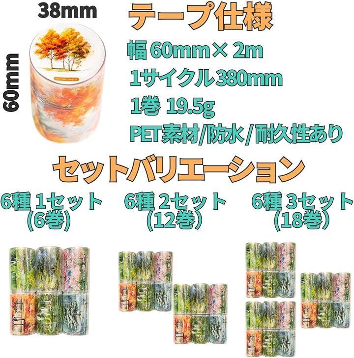 「商品仕様」1セット約60mmx2m 1ループ約380mm 1セット6種6巻 「バリエーション」1セット6種6巻、2セット6種12巻、3セット6種18巻「素材」PET 防水耐久性あり