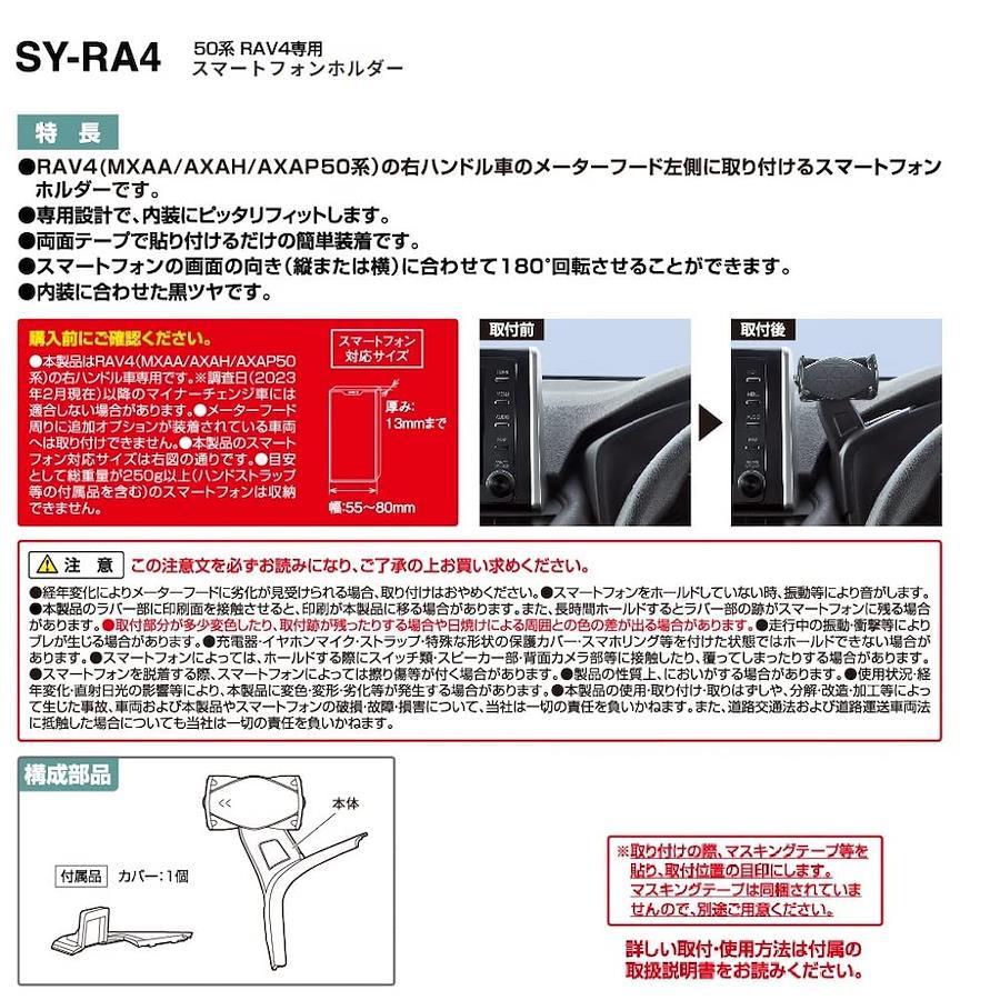 ●トヨタRAV4 (MXAA/AXAH/AXAP50系)の右ハンドル車のメーターフード左側に取り付けるスマートフォンホルダーです。※調査日(2023年2月現在)以降のマイナーチェンジ車には適合しない場合があります。●専用設計で、内装にピッタリフィットします。●両面テープで貼り付けるだけの簡単装着です。●スマートフォンの画面の向き(縦または横)に合わせて180°回転させることができます。●内装に合わせた黒ツヤです。※メーターフード周りに追加オプションが装着されている車両へは取付できません。