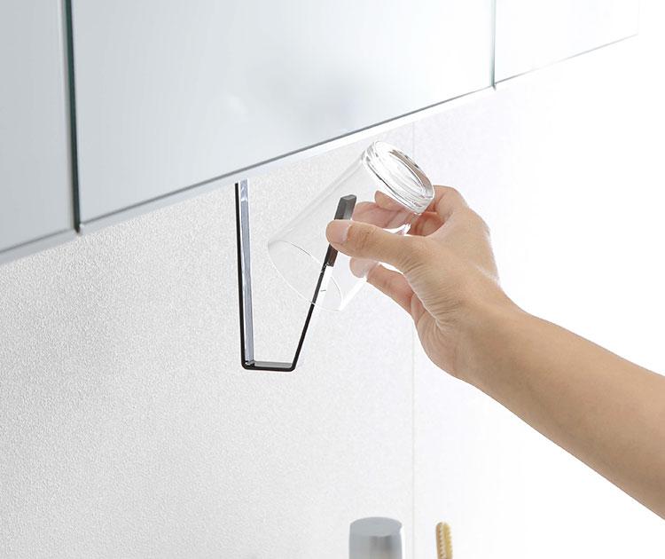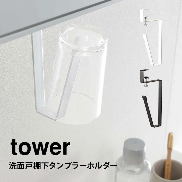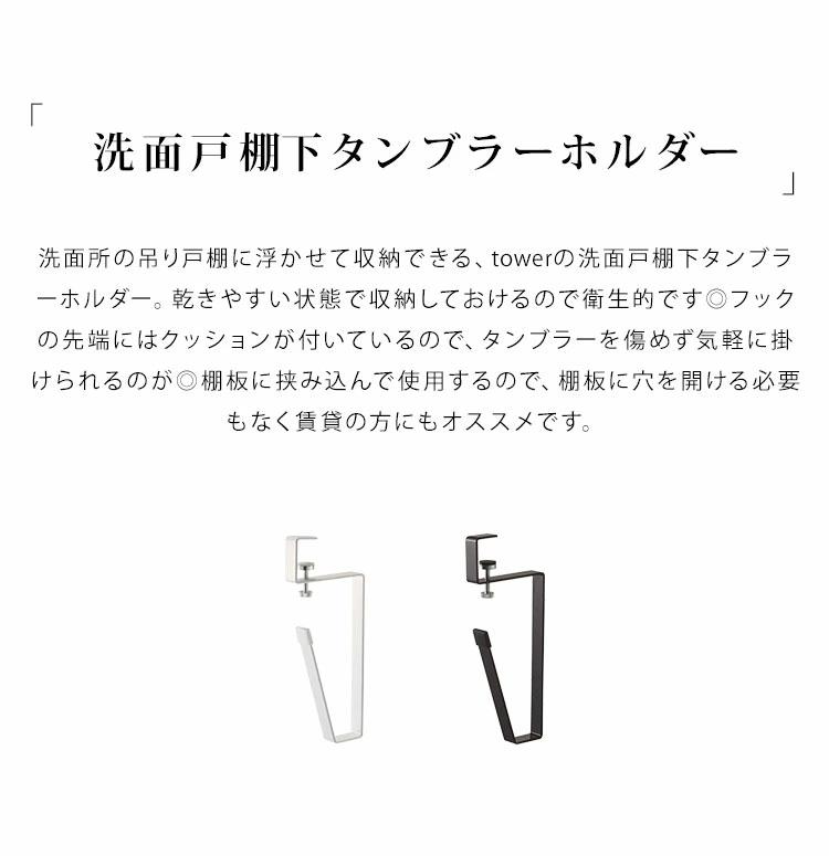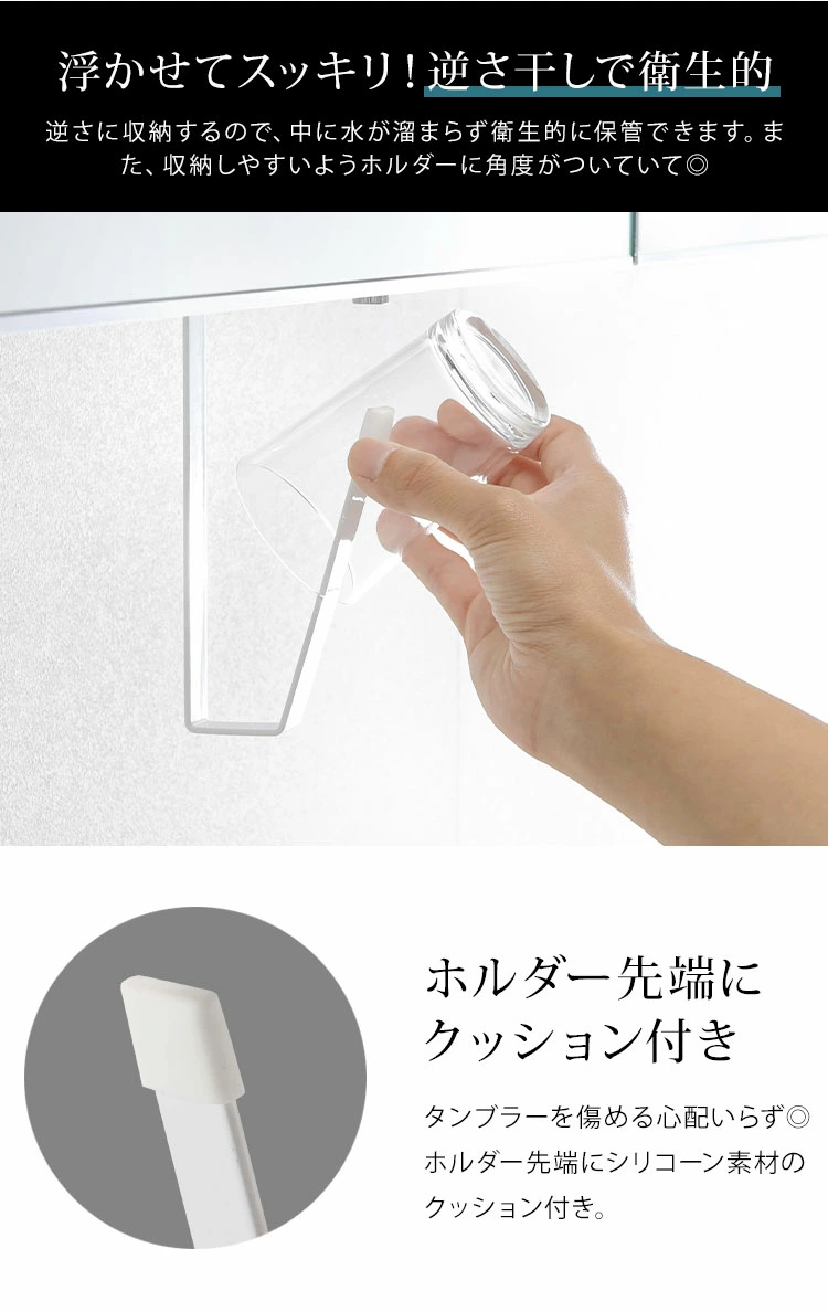 【洗面戸棚下タンブラーホルダー】洗面所の吊り戸棚に浮かせて収納できる、towerの洗面戸棚下タンブラーホルダー。乾きやすい状態で収納しておけるので衛生的です◎フックの先端にはクッションが付いているので、タンブラーを傷めず気軽に掛けられるのが◎棚板に挟み込んで使用するので、棚板に穴を開ける必要もなく賃貸の方にもオススメです。