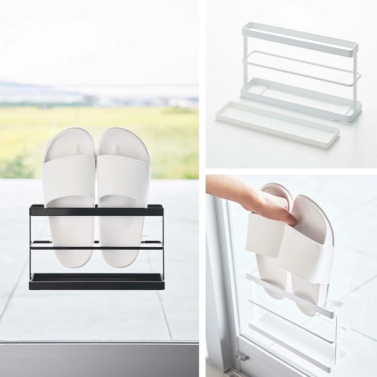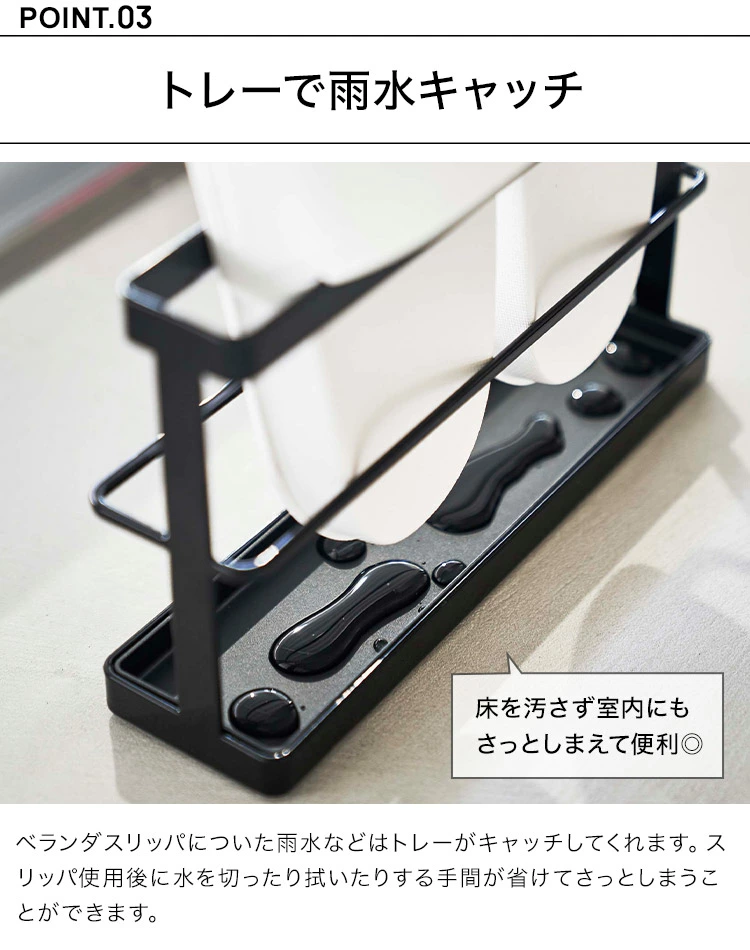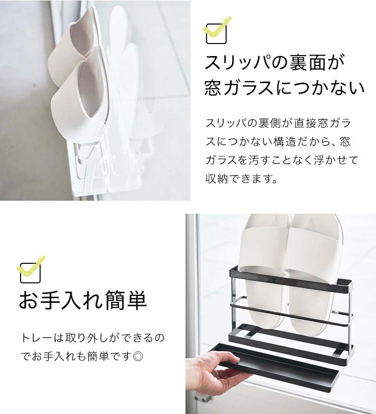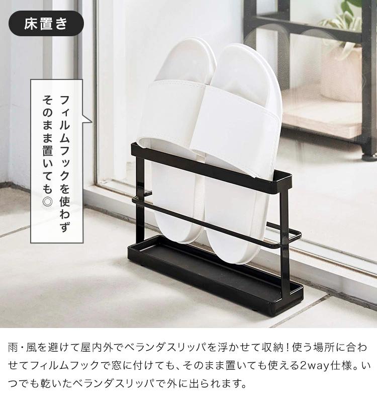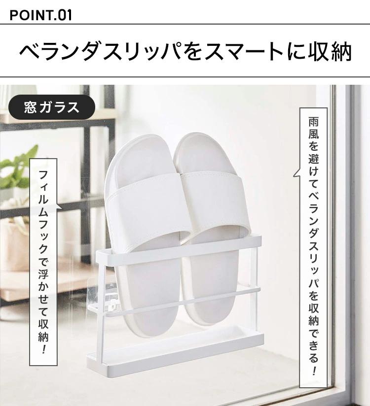 【ツーウェイベランダスリッパラック トレー付き】フィルムフックで窓ガラスに簡単取り付け!雨・風を避けて屋内外でベランダスリッパを浮かせて収納!使う場所に合わせてフィルムフックで窓に付けても、そのまま置いても使える2way仕様。いつでも乾いたベランダスリッパで外に出られます。スリッパの裏面が窓ガラスに付かない設計です。そのまま床に置いて使うこともできます。ベランダスリッパに付いた雨水等もトレーがキャッチするので室内でも使用可能。トレーは取り外しができるのでお手入れ簡単◎