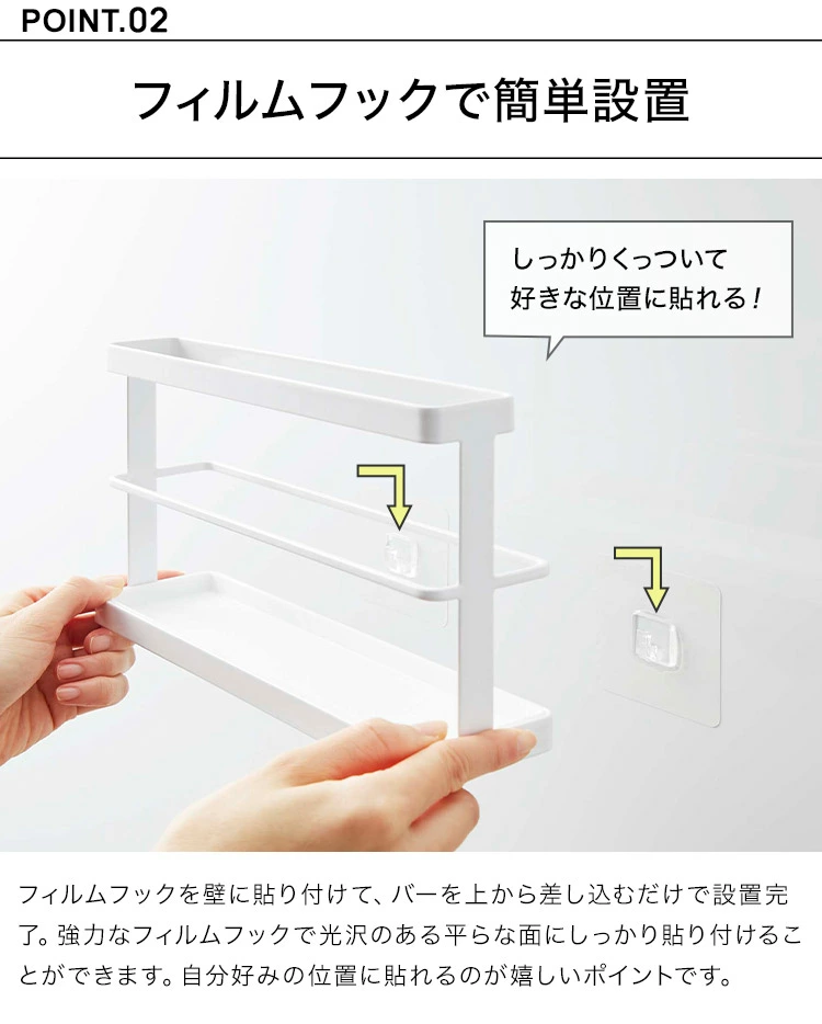 ■サイズ本体:約H15×W25×D6.5cm(フィルムフック含まず)トレー:約H1.3×W24.5×D6cmフィルムフック接着面:約H7×W7cm(1つあたり)