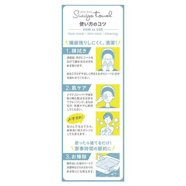 【使用方法】・顔拭き:洗顔後、両手にシートを広げて顔全体の水分を拭き取ります。肌をこすらずやさしく押さえながらシートに水分を吸わせてください。・肌ケア:メイクリムーバーや拭き取り用化粧水を含ませてクレンジング、または毛穴・角質ケアに使用してください。おすすめ!石けんで泡立てたら、身体洗い用スポンジとしても使えます。・お掃除:顔を拭いた後のシートで洗面所などの水まわりの拭き取りにも使えます。