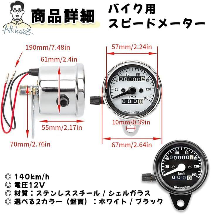 「商品内容」 バイク用スピードメーター(140km/h) 材質:ステンレススチール/シェルガラス 本体カラー:シルバー (盤面):ホワイト/ブラック サイズ:外径/約67mm 内径/約57mm 厚み/約55mm 電圧/12V