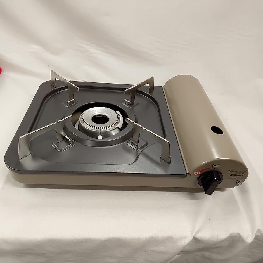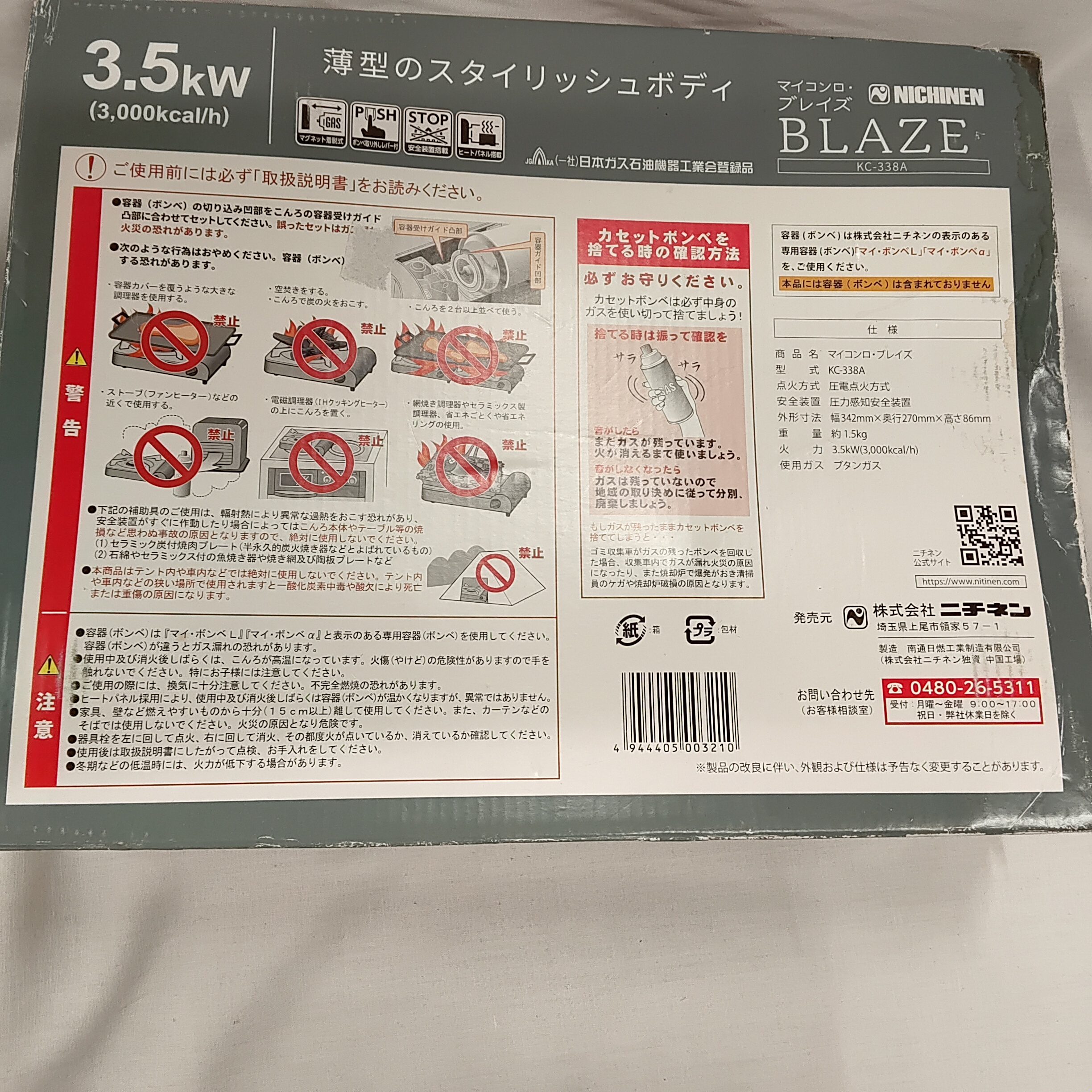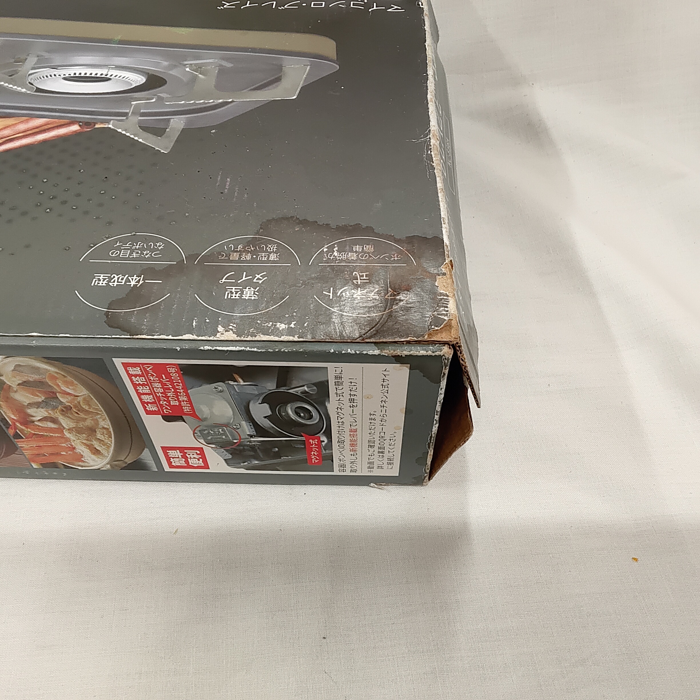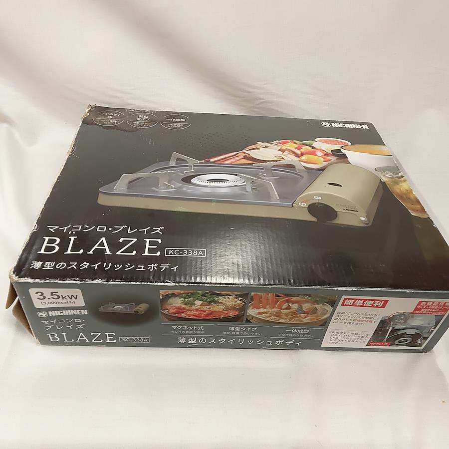 未使用 カセットコンロ マイコンロ・ブレイズです。未使用ですが、長期保管のため経年劣化があります。外箱に汚れ、シミ、ヤケ等、経年劣化があります。中確認、写真撮影のため箱を開け、ビニールも外しました。薄型でスタイリッシュなデザインが特徴のハイカロリーコンロです。