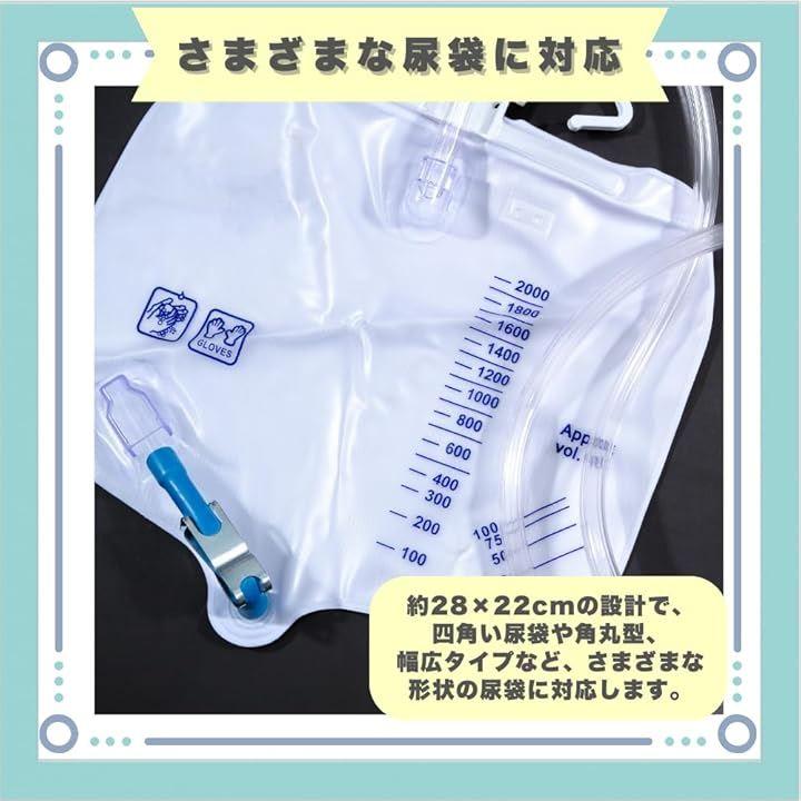 「さまざまな尿袋に対応」約28x22cmの設計で、四角い尿袋や角丸型、幅広タイプなど、さまざまな形状の尿袋に対応します。