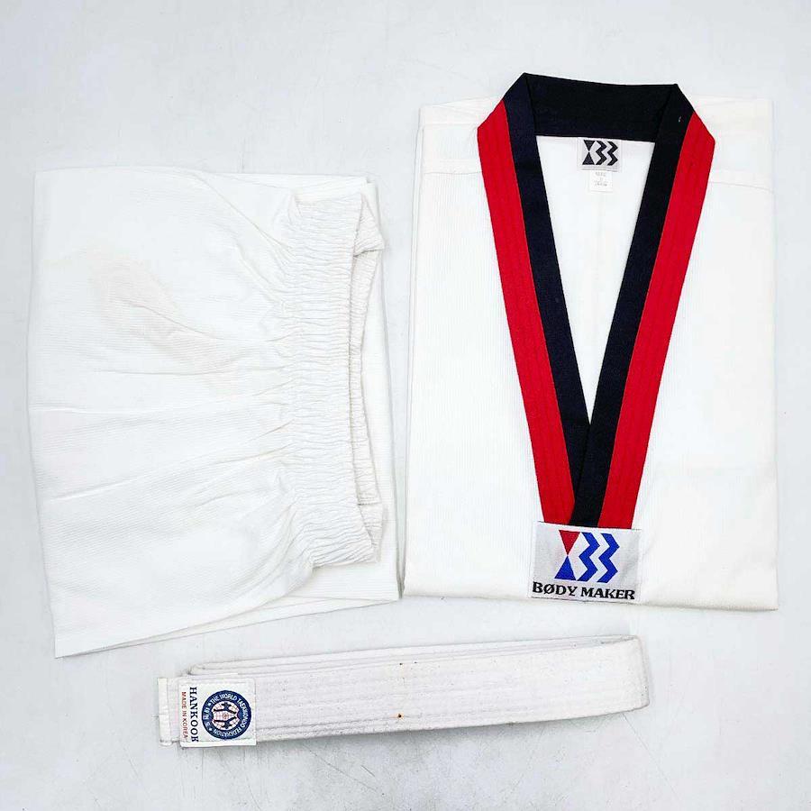 [タイプ] BODY MAKER Taekwond テコンドー 道着[表記サイズ] 140[身幅] 約46cm[着丈] 約64cm[総丈] 約85cm[ウエスト] 約25cm[状態] 未使用長期保管品(保管に伴いある程度の汚れがみられます。)