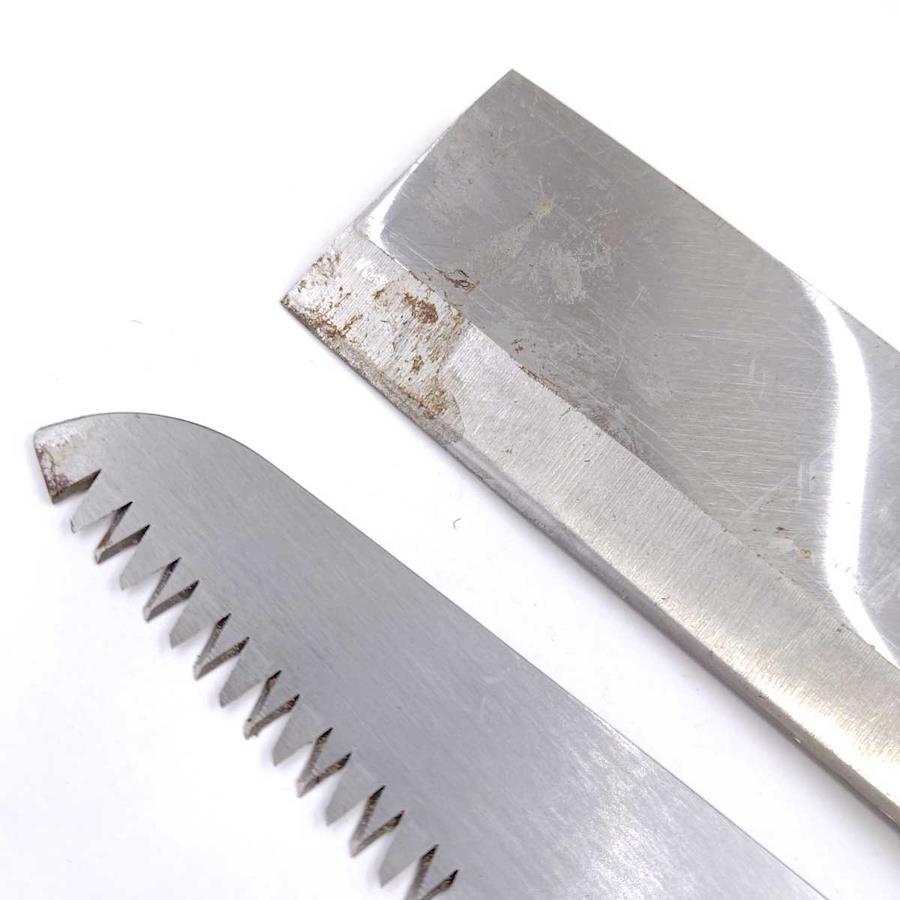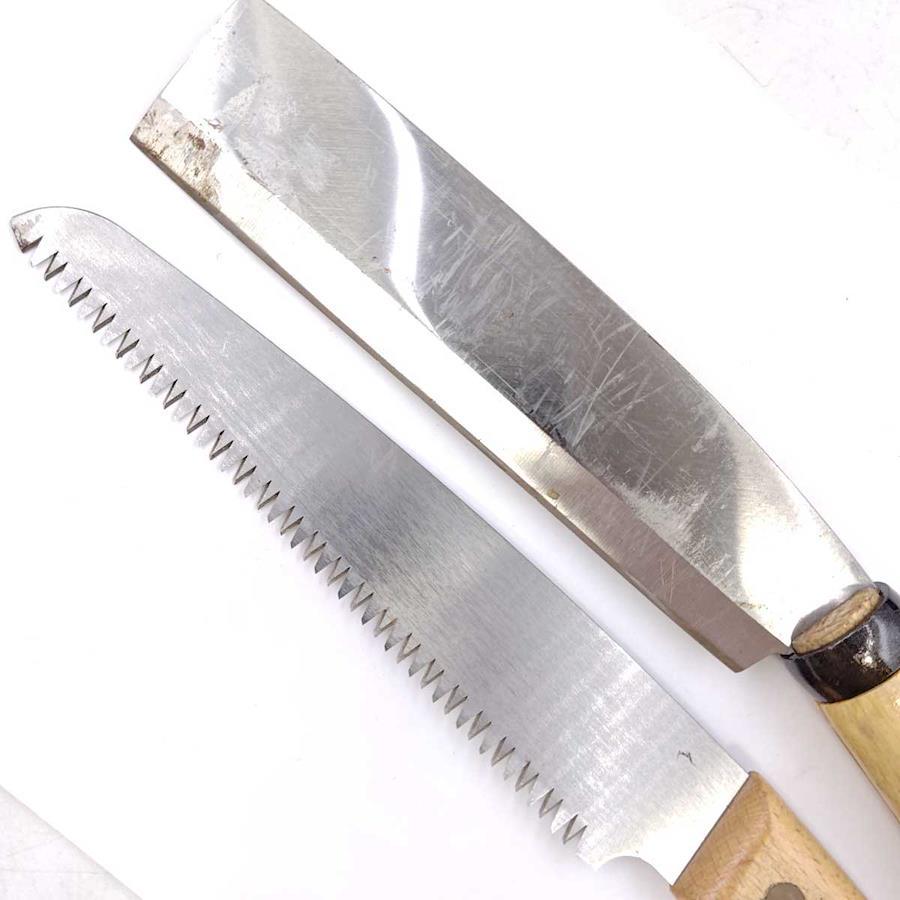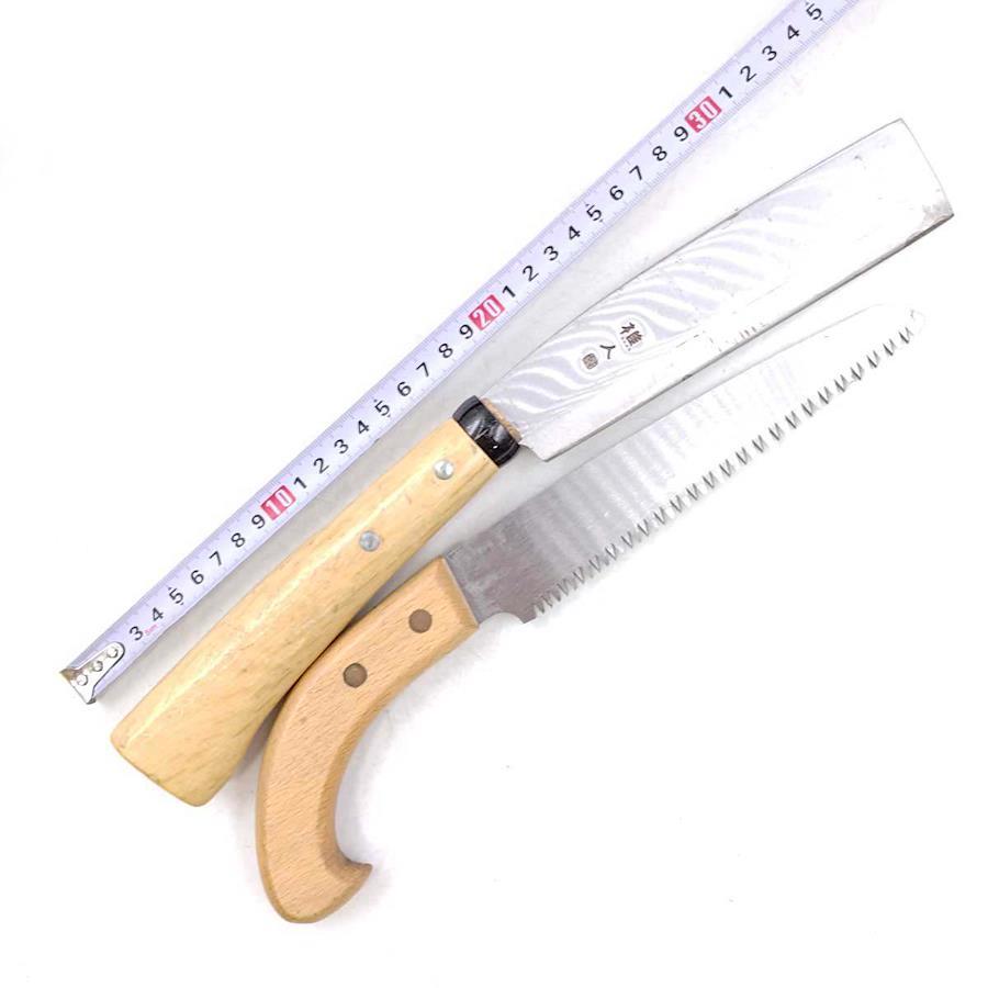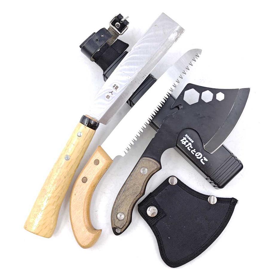 [タイプ] なたとのこ 2丁組 NS-180 手斧 セット[サイズ] 手斧 全長約26.5cm[状態] ある程度のキズや汚れ、サビがみられます。また、ノコギリは画像のように少し曲がっています。