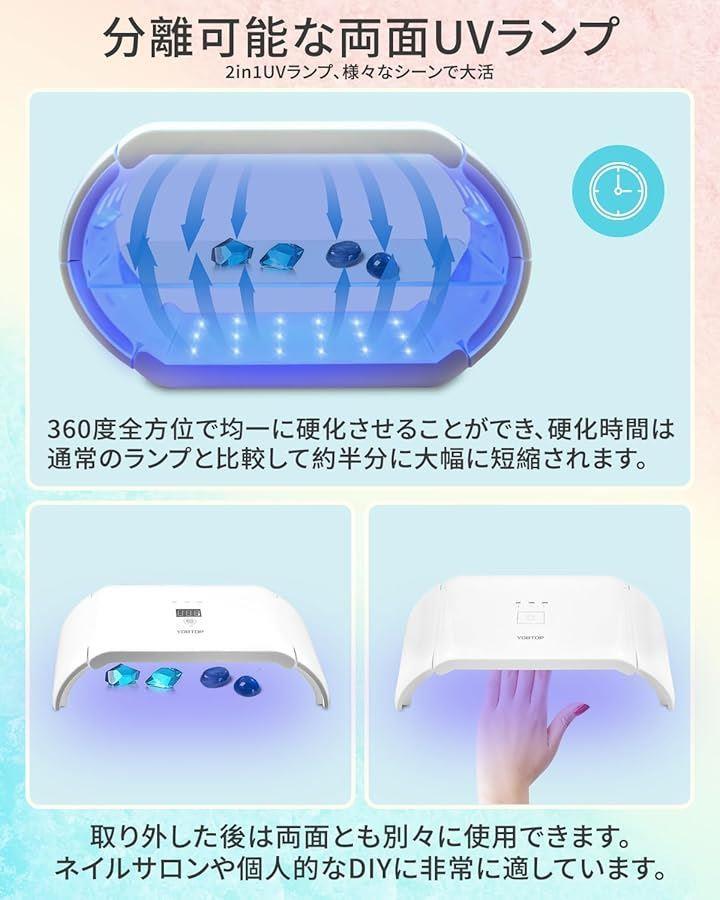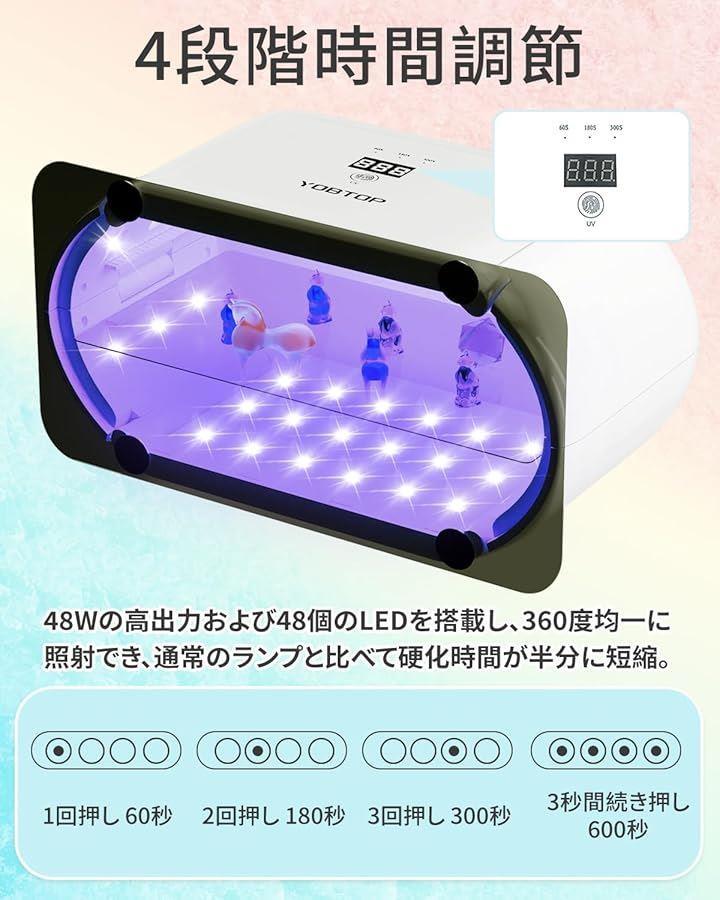 「最新モデルのパワフルなUVライト」YOBTOPの最新モデルは、48Wの強力な出力で、UVレジンやジェルネイルを素早く硬化させます。