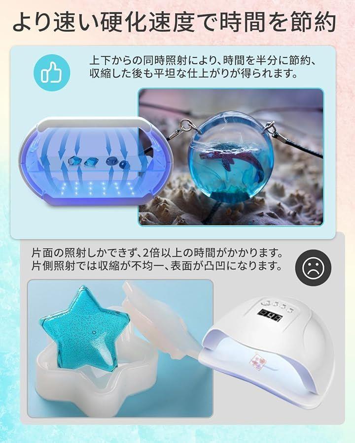 両面照射機能により、どの角度からでもしっかり硬化し、UVレジンの収縮を抑え、時間と労力を節約します。