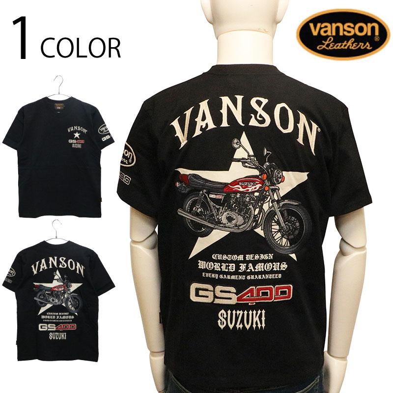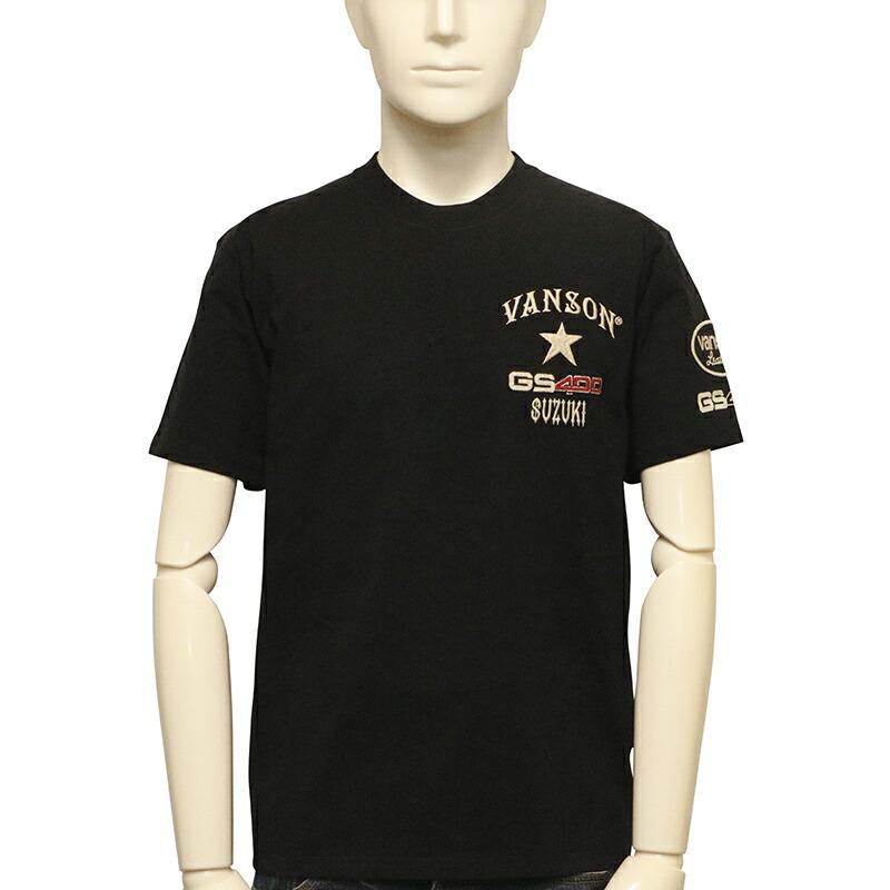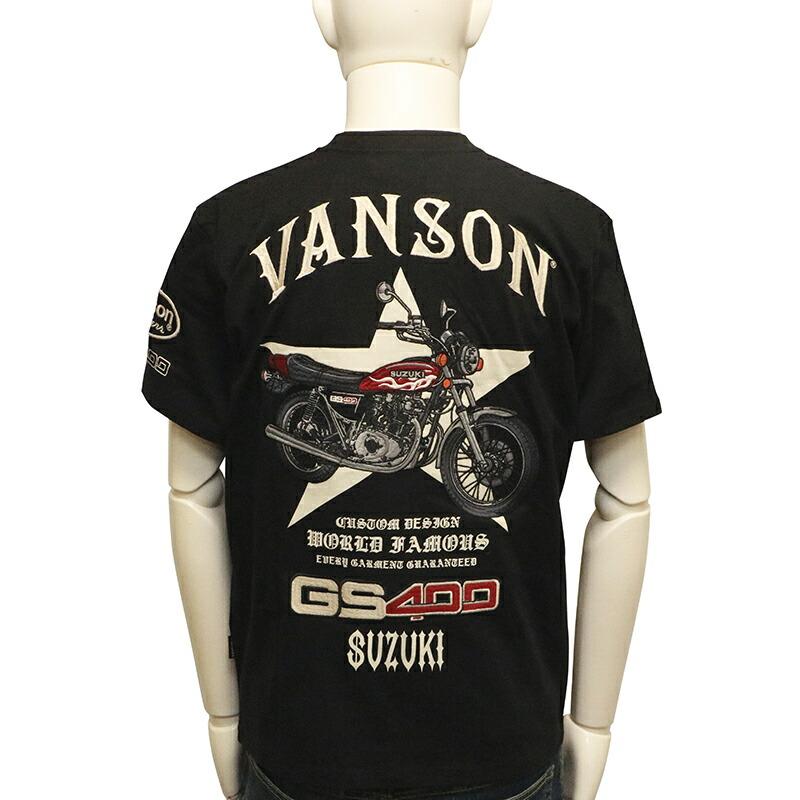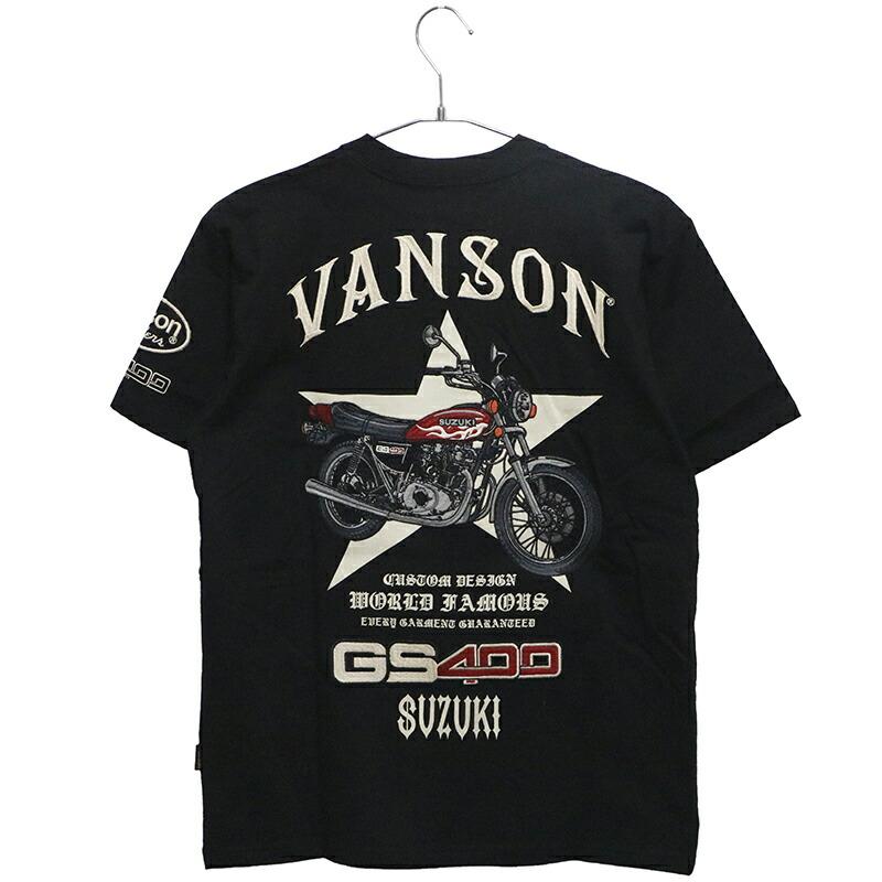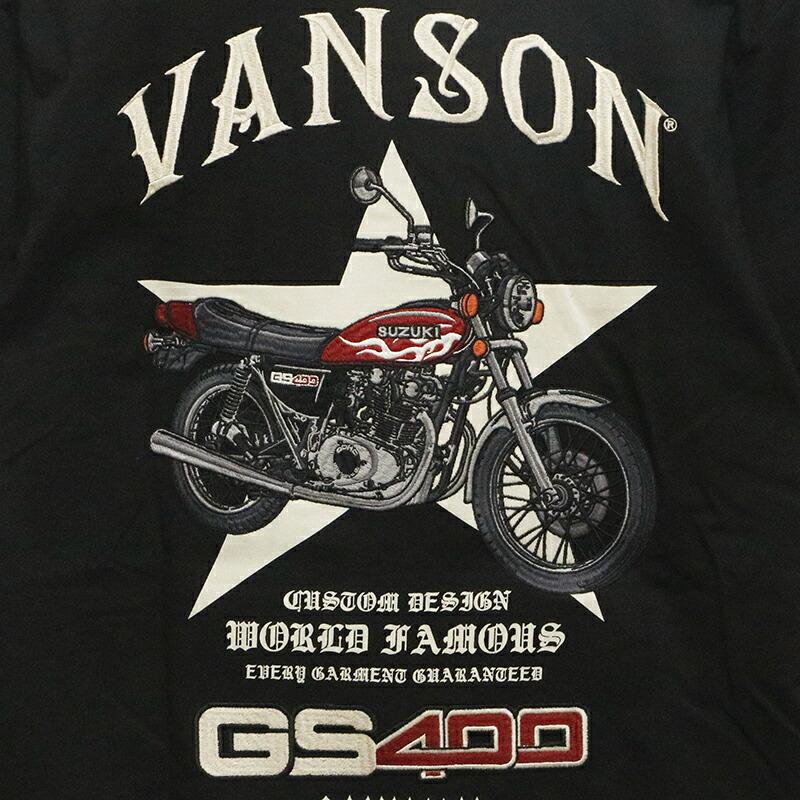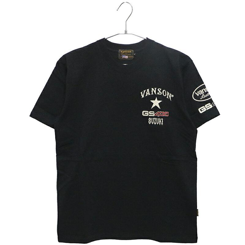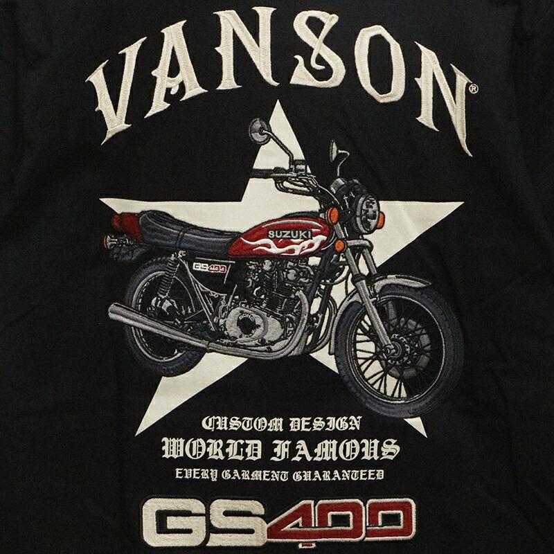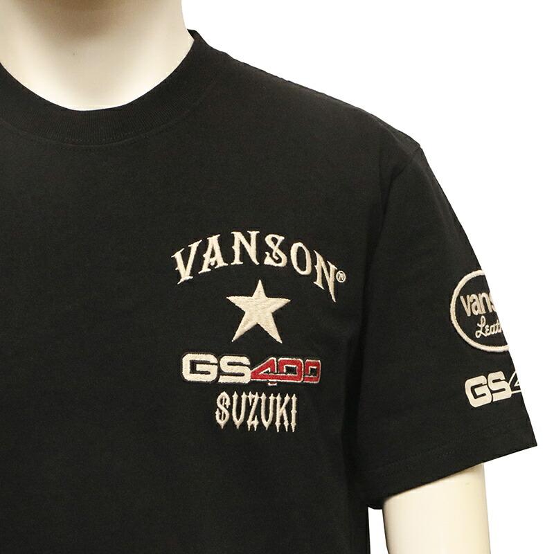 【デザイン】VANSON×SUZUKIから半袖Tシャツの登場。旧車 GS400 柄 刺繍 天竺 半袖 Tシャツです。SUZUKIとのコラボデザイン。スズキ初の400cc4ストロークDOHC直列2気筒エンジンを搭載SUZUKIの旧車「GS400」を落とし込んだ半袖Tシャツ。周りには、VANSONロゴ、スター、GS400ロゴなど刺繍や抜染プリントを組み合わせ配置。フロントには左胸にVANSONロゴ、スター、GS400ロゴ、SUZUKIロゴを刺繍で配置。左袖にはVANSONロゴワッペンを取付、その下にGS400ロゴを抜染。