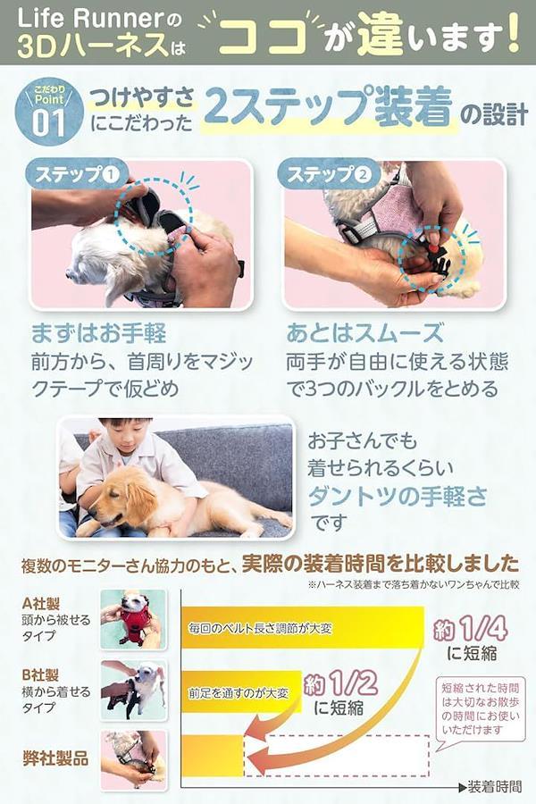 お腹を保護する同タイプの犬用ハーネスと比べて、手軽さが大幅に向上しました。