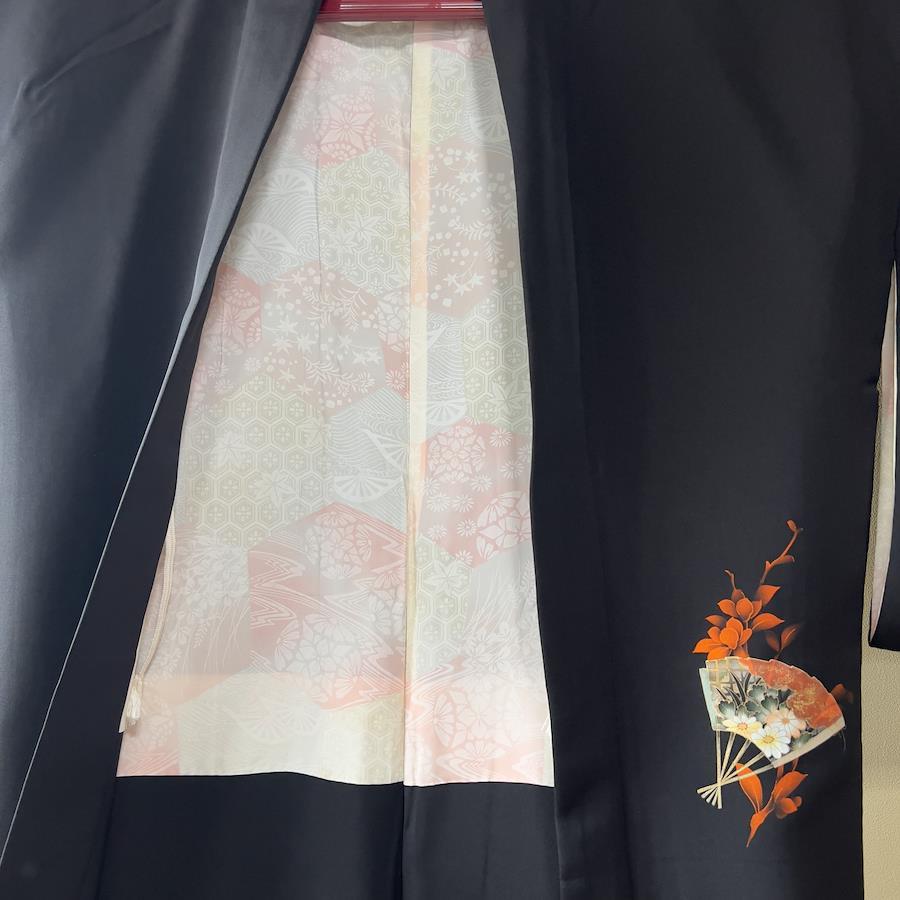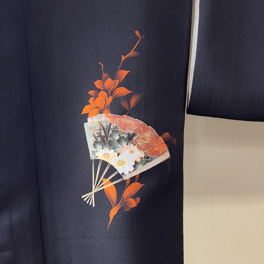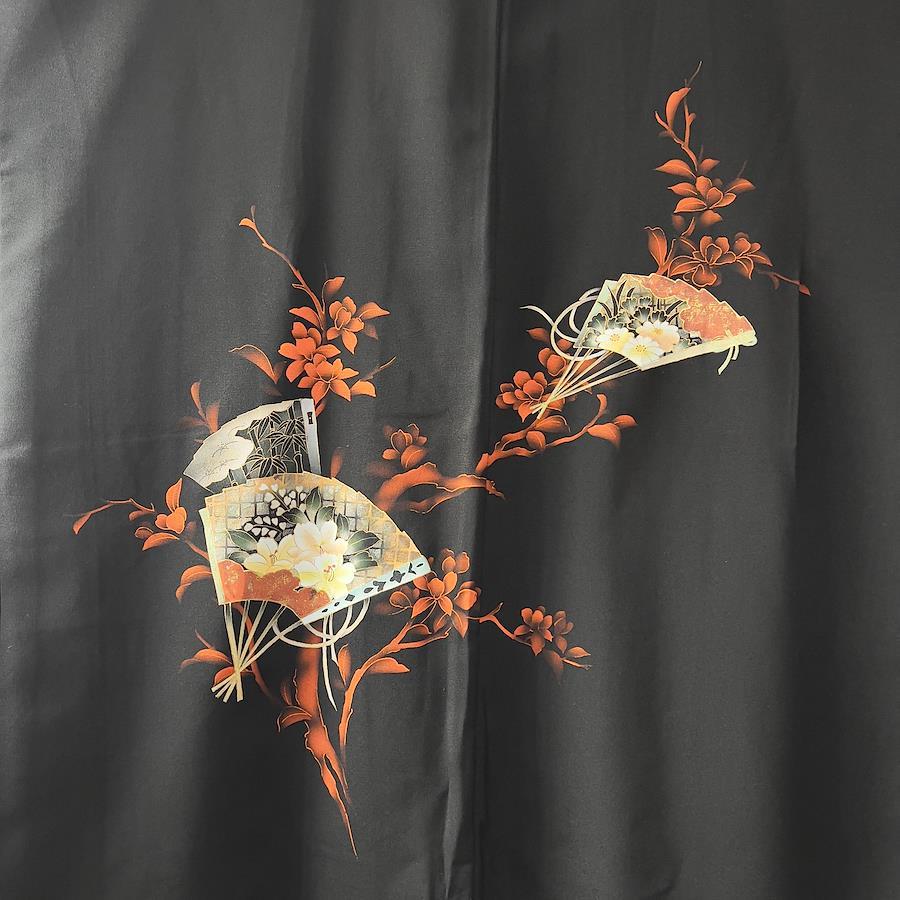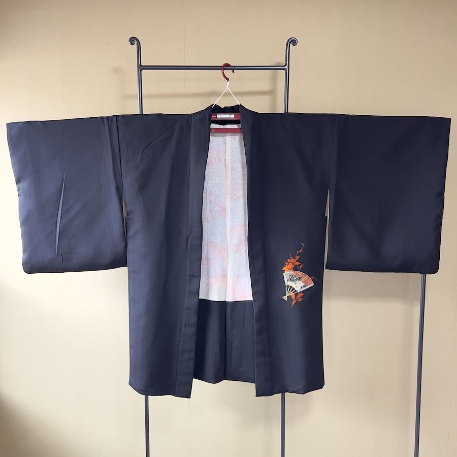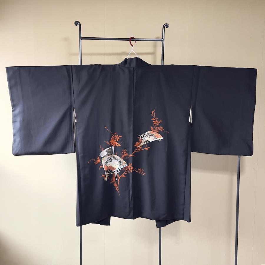 これはヴィンテージの羽織です。こちらは手描きで柄が描かれています。黒の羽織はデニムやスカートと合わせてドレスアップも楽しみやすく人気な商品です。