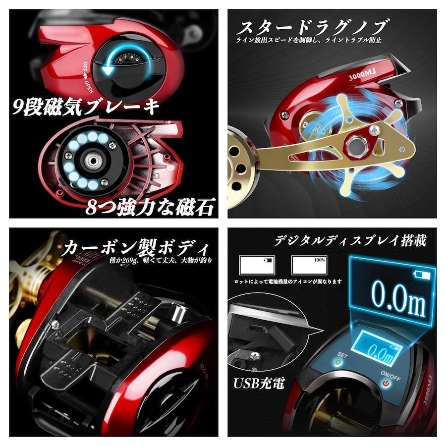 左ハンドル 右ハンドル からお選べます。 (竿、釣り糸 付きません)付属品:リール本体 /充電ケーブル /簡易説明書 /分解図(英語.中国語)【製品仕様】自重約269G ギア比:6.4:1 ドラグ力:20kg ベアリング数:6+1スプール巻糸量:2.0#/380m 3.0#/260m 4.0#/170m 5.0#/110m【超軽量&高性能】リール本体重量僅か269g、丈夫な品質で超軽量で長時間に使っても腕に負担をかけません。20kgまでのドラグシステムを搭載します。【耐腐食】 高強度カーボン製ボディ、アルミニウムスプール、密封ステンレススベアリング。腐食保護を強化し、淡水だけでなく、海釣りでも安心してお使い頂けます。【強力なマグネットブレーキ】 バックラッシュしにくいマグネットブレーキシステムで逆回転防止、ラインの出過ぎも抑止し、トラブルを防ぎます。【用途】淡水釣り、海釣り、船釣りなど、初心者からベテランまで幅広い対応できます。いつでも、どこでも、釣りを楽しむことを可能にします。ご注意:輸入品のため、キズは多少あります(パネル部)。