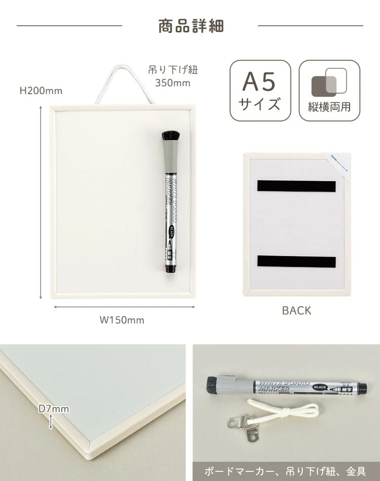 ■付属品ボードマーカー(直液式細字/黒インク)1本吊り下げ用ヒモ(35cm)1本吊り下げ用金具 2個