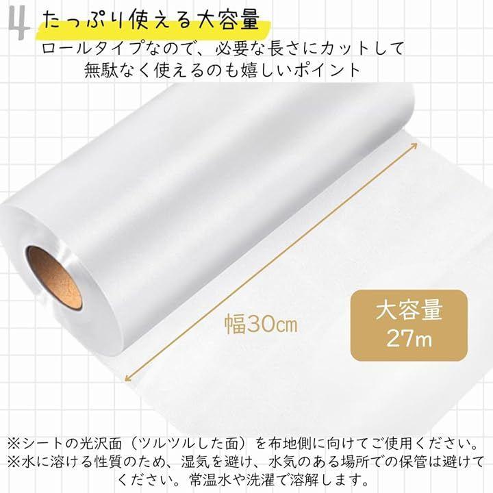 「商品詳細」サイズ:幅:30cm / 長さ27m カラー:クリア *シートの光沢面(ツルツルした面)を布地側に向けてご使用ください。