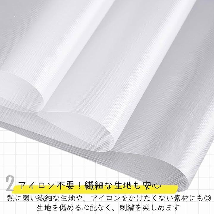 「アイロン不要で繊細な生地にも安心。」熱に弱い繊細な生地に刺繍したいけど、アイロンを使うのは心配…という方に。この水溶性シートならアイロンを使わずに刺繍できるので、生地を傷める心配がありません。