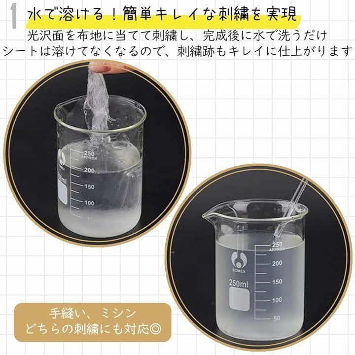 「水で溶けるから簡単キレイ。」複雑なデザインやロゴも、この水溶性シートを使えば、より簡単に美しく刺繍できます。光沢面を布地に当てて刺繍するだけで、細かい模様も綺麗に再現できます。