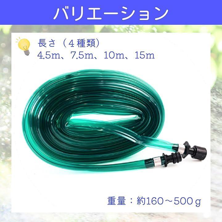 「商品詳細」ホースの長さ:4.5m(160g)、7.5m(250g)、10m(330g)、15m(500g) 素材:PVC製*商品写真はできる限り実物の色に近づけるよう徹底しておりますが、 お使いのモニター設定、お部屋の照明等により実際の商品と色味が異なる場合がございます。