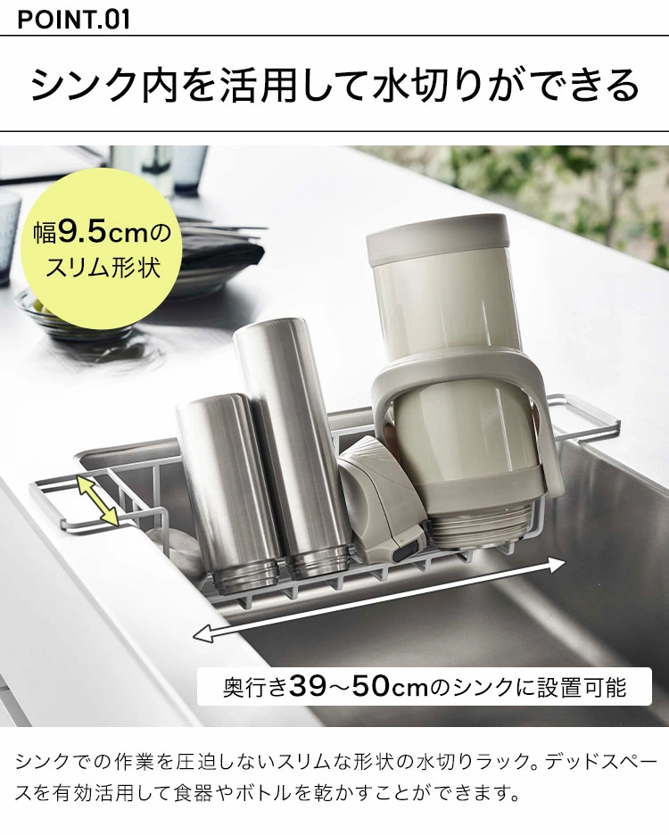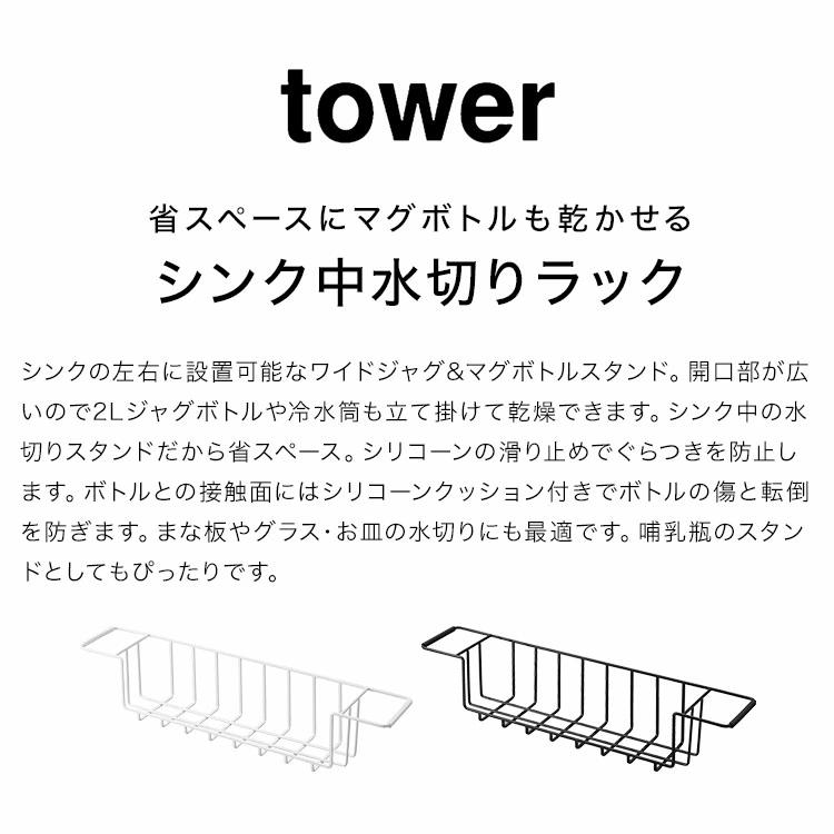 【シンク中ワイドジャグ&マグボトルスタンド】シンクの左右に設置可能なワイドジャグ&マグボトルスタンド。開口部が広いので2Lジャグボトルや冷水筒も立て掛けて乾燥できるシンク中の水切りスタンド。シリコーンの滑り止めでぐらつきを防止。ボトルとの接触面にはシリコーンクッション付きでボトルの傷と転倒を防ぎます。まな板やグラス・お皿の水切りにも最適です。哺乳瓶のスタンドとしてもぴったりです。
