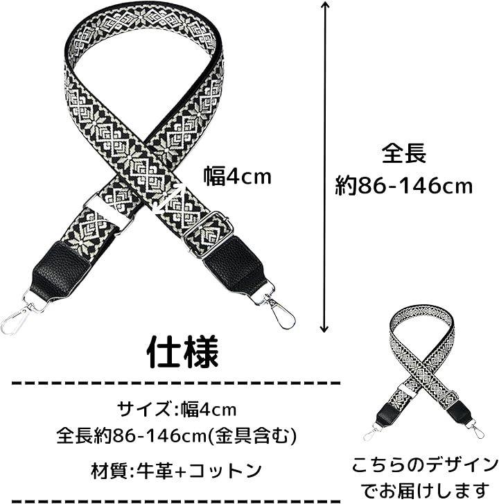 「商品スペック」サイズ:長さ86~146cm、幅4cm、素材:コットン+本革