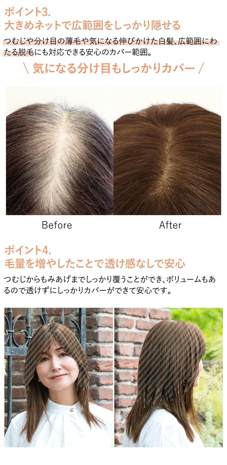 クリップで地毛に固定し半頭部分を広範囲にカバーできるウィッグです。