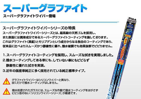 ■スーパーグラファイトワイパーシリーズの特徴スーパーグラファイトワイパーシリーズとは、最高級の天然ゴムを採用し、また表面には潤滑成分であるスーパーグラファイトコーティングを施しております。これはグラファイト(黒鉛)とモリブデンという成分からなる独自のコーティングであり、従来品に比べよりスムーズかつ静粛性に優れ、撥水被膜でも効果抜群でビビりません。